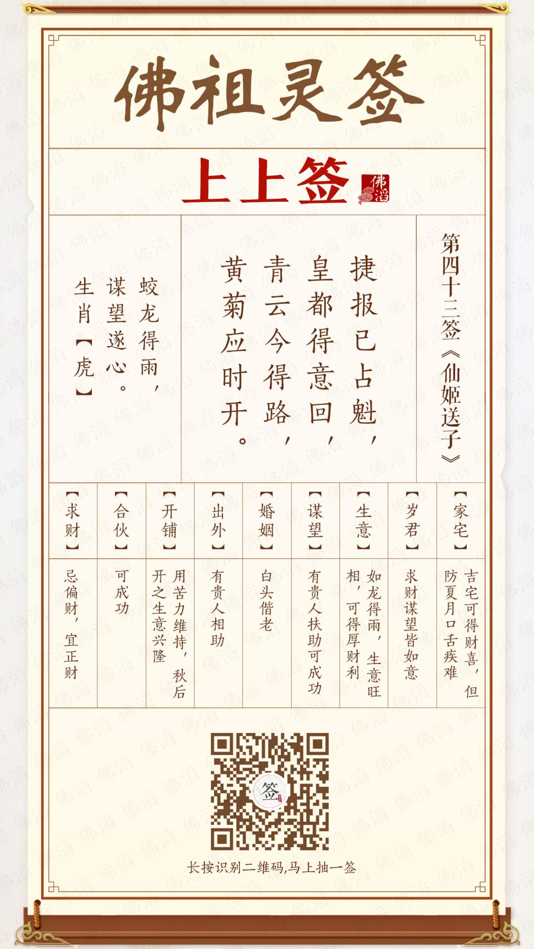 福星高照汝家门,些小忧疑不必论,欲安稳时财禄足,神前多把好香焚,《吉宅可得财喜,但防夏月口舌疾难,主事人操心劳烦,是厝前受杀冲伤,每逢塑望两日应拜天地保平安,并求佛祖令旗安门上祭化平安 》