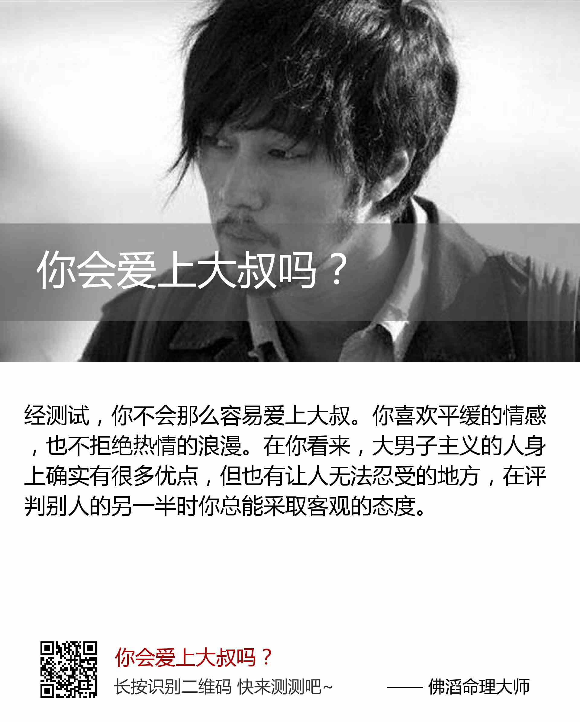 你喜欢平缓的情感,也不拒绝热情的浪漫。在你看来,大男子主义的人身上确实有很多优点,但也有让人无法忍受的地方,在评判别人的另一半时你总能采取客观的态度。
