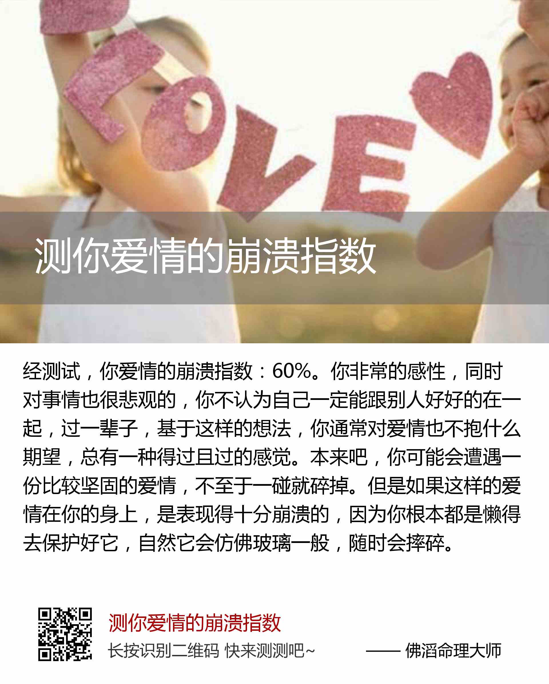 你非常的感性,同时对事情也很悲观的,你不认为自己一定能跟别人好好的在一起,过一辈子,基于这样的想法,你通常对爱情也不抱什么期望,总有一种得过且过的感觉。本来吧,你可能会遭遇一份比较坚固的爱情,不至于一碰就碎掉。但是如果这样的爱情在你的身上,是表现得十分崩溃的,因为你根本都是懒得去保护好它,自然它会仿佛玻璃一般,随时会摔碎。