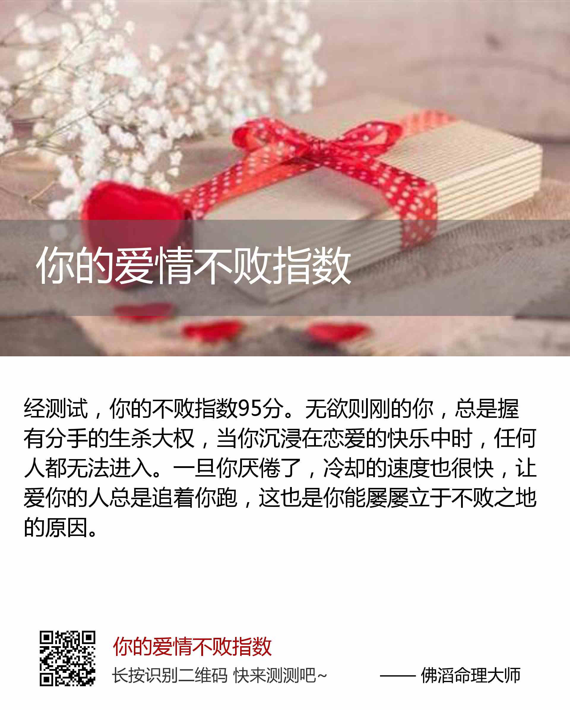 无欲则刚的你,总是握有分手的生杀大权,当你沉浸在恋爱的快乐中时,任何人都无法进入。一旦你厌倦了,冷却的速度也很快,让爱你的人总是追着你跑,这也是你能屡屡立于不败之地的原因。