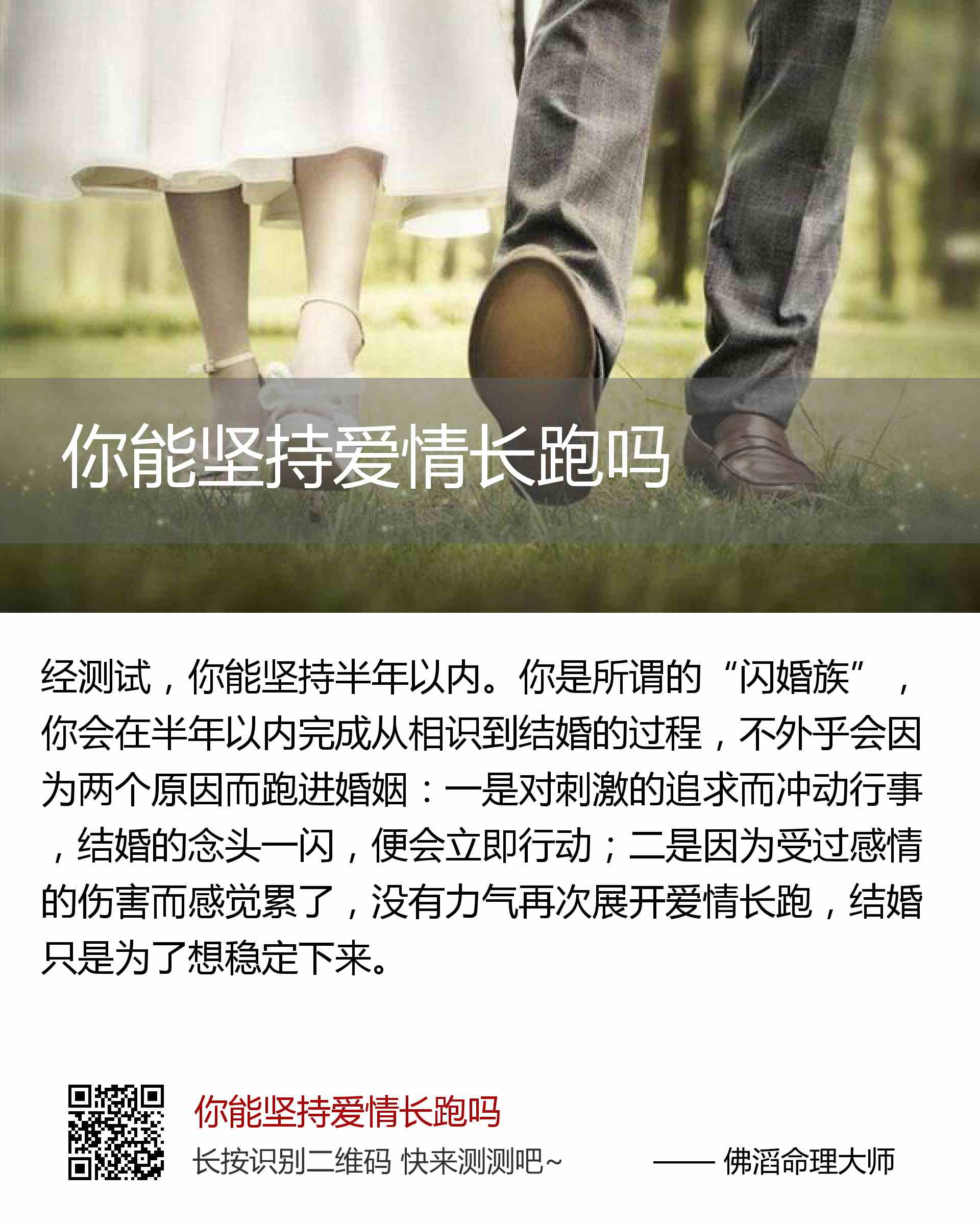 你是所谓的“闪婚族”,你会在半年以内完成从相识到结婚的过程,不外乎会因为两个原因而跑进婚姻:一是对刺激的追求而冲动行事,结婚的念头一闪,便会立即行动;二是因为受过感情的伤害而感觉累了,没有力气再次展开爱情长跑,结婚只是为了想稳定下来。