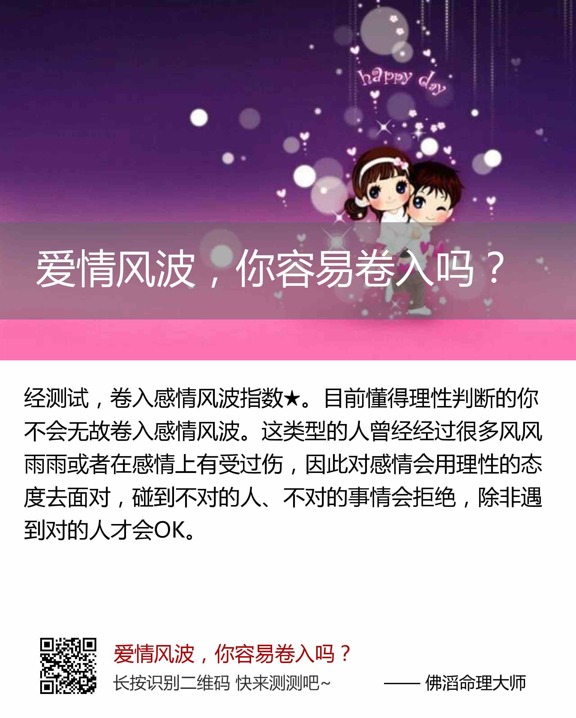 目前懂得理性判断的你不会无故卷入感情风波。这类型的人曾经经过很多风风雨雨或者在感情上有受过伤,因此对感情会用理性的态度去面对,碰到不对的人、不对的事情会拒绝,除非遇到对的人才会OK。