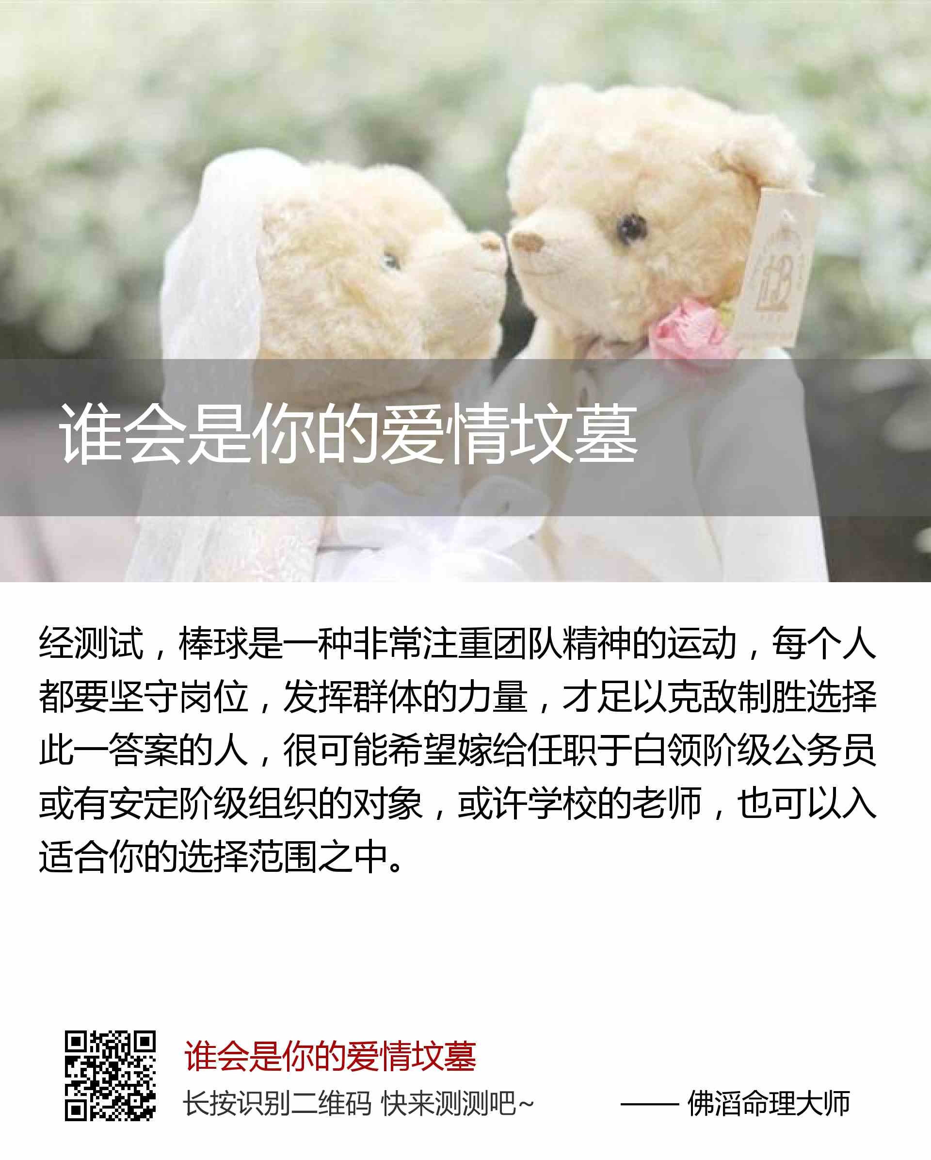 棒球是一种非常注重团队精神的运动,每个人都要坚守岗位,发挥群体的力量,才足以克敌制胜选择此一答案的人,很可能希望嫁给任职于白领阶级公务员或有安定阶级组织的对象,或许学校的老师,也可以入适合你的选择范围之中。