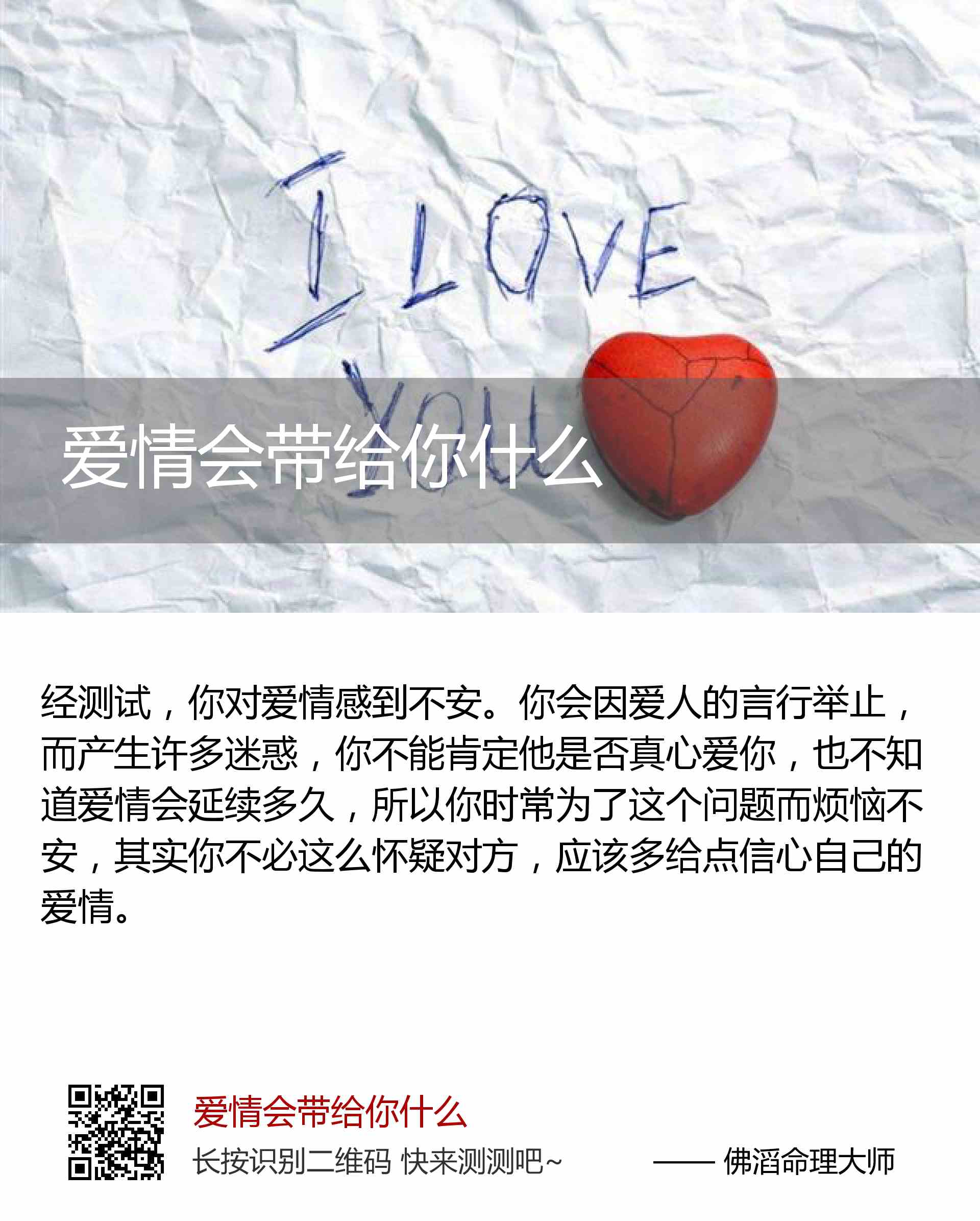 你会因爱人的言行举止,而产生许多迷惑,你不能肯定他是否真心爱你,也不知道爱情会延续多久,所以你时常为了这个问题而烦恼不安,其实你不必这么怀疑对方,应该多给点信心自己的爱情。