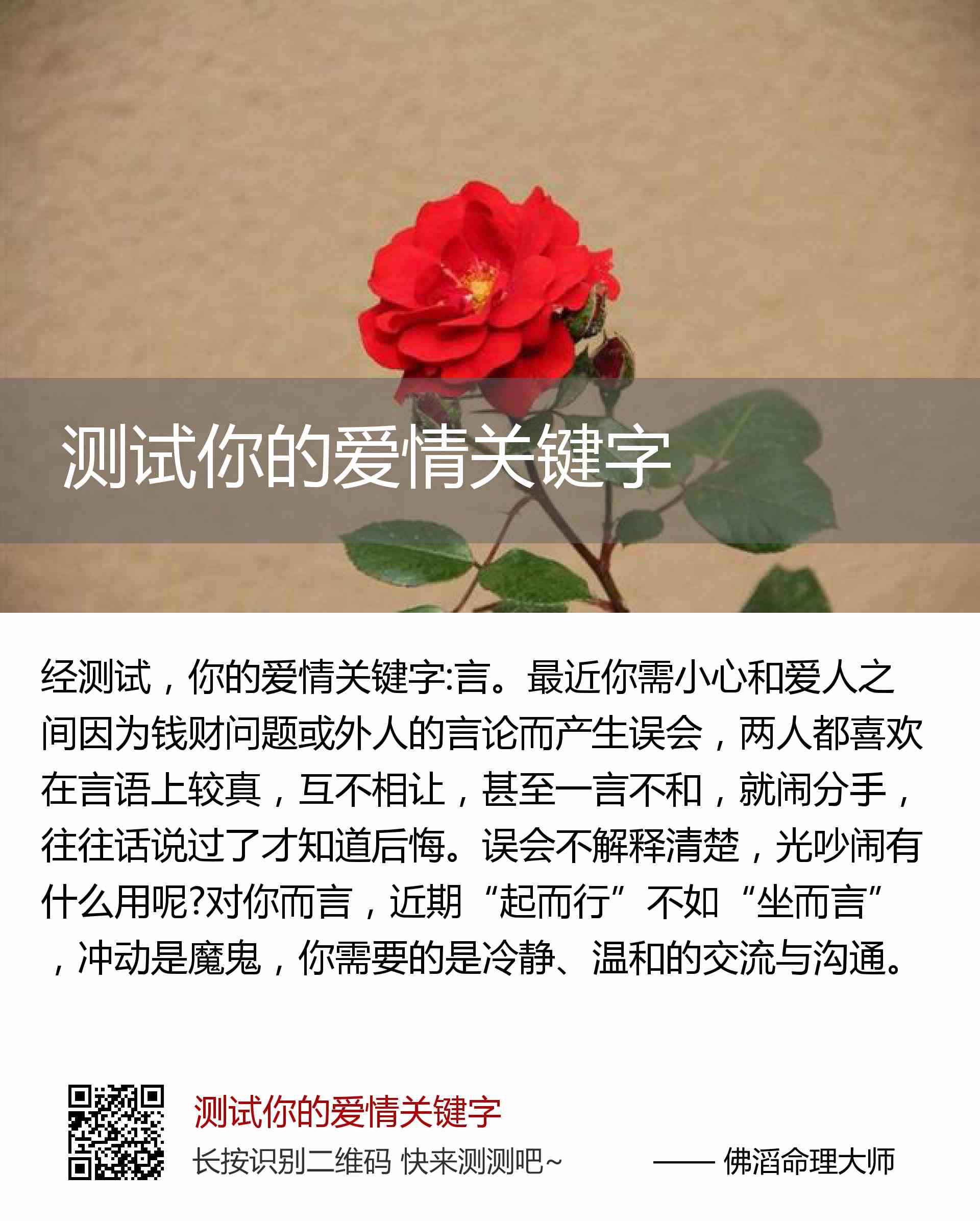 最近你需小心和爱人之间因为钱财问题或外人的言论而产生误会,两人都喜欢在言语上较真,互不相让,甚至一言不和,就闹分手,往往话说过了才知道后悔。误会不解释清楚,光吵闹有什么用呢?对你而言,近期“起而行”不如“坐而言”,冲动是魔鬼,你需要的是冷静、温和的交流与沟通。