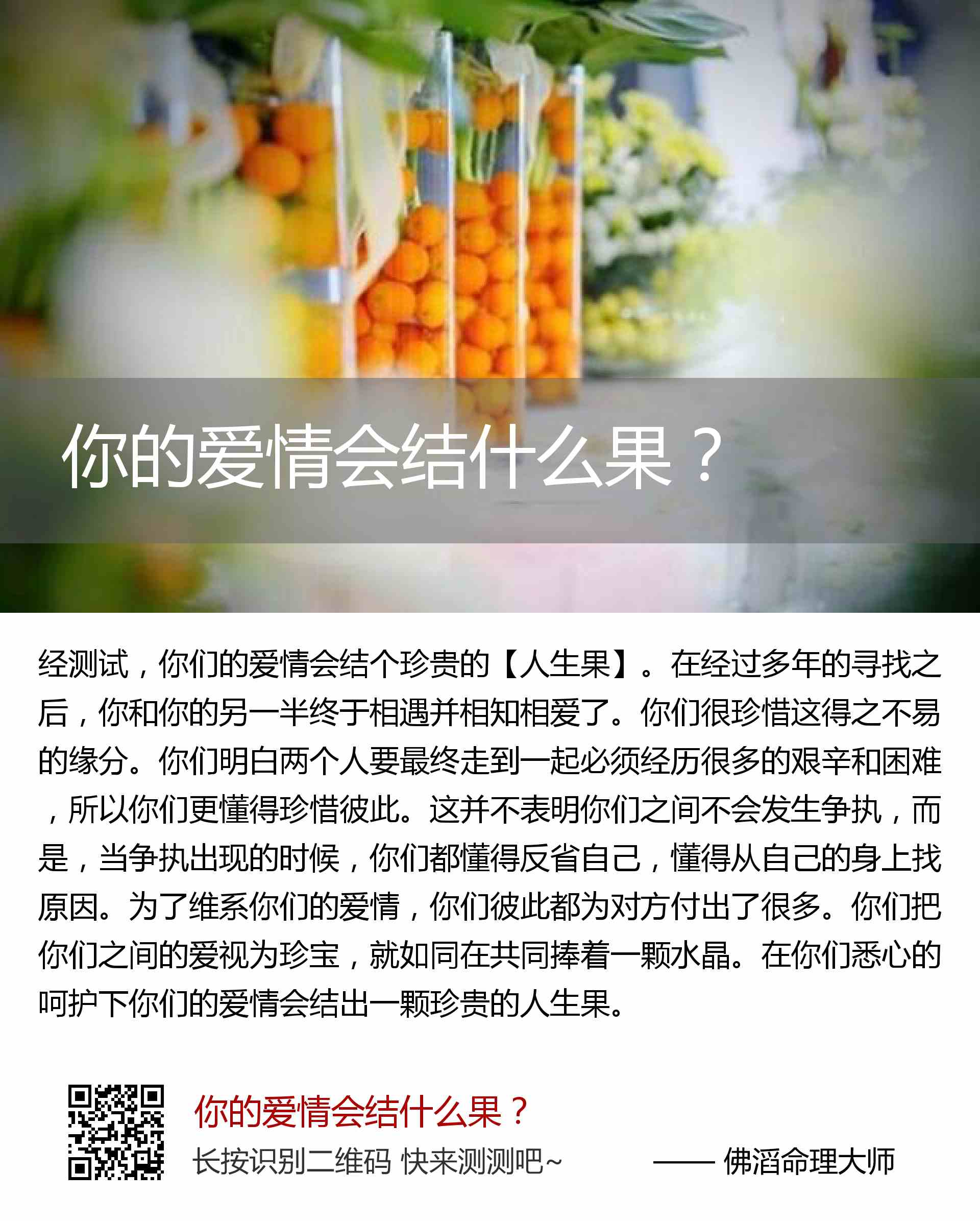 在经过多年的寻找之后,你和你的另一半终于相遇并相知相爱了。你们很珍惜这得之不易的缘分。你们明白两个人要最终走到一起必须经历很多的艰辛和困难,所以你们更懂得珍惜彼此。这并不表明你们之间不会发生争执,而是,当争执出现的时候,你们都懂得反省自己,懂得从自己的身上找原因。为了维系你们的爱情,你们彼此都为对方付出了很多。你们把你们之间的爱视为珍宝,就如同在共同捧着一颗水晶。在你们悉心的呵护下你们的爱情会结出一颗珍贵的人生果。