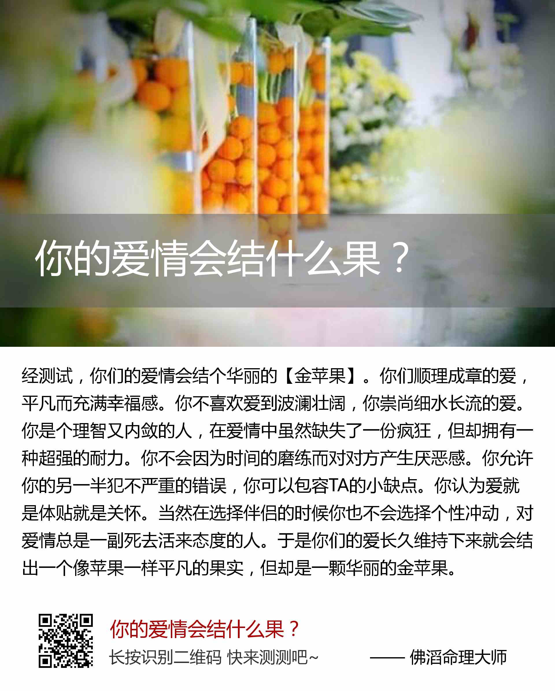 你们顺理成章的爱,平凡而充满幸福感。你不喜欢爱到波澜壮阔,你崇尚细水长流的爱。你是个理智又内敛的人,在爱情中虽然缺失了一份疯狂,但却拥有一种超强的耐力。你不会因为时间的磨练而对对方产生厌恶感。你允许你的另一半犯不严重的错误,你可以包容TA的小缺点。你认为爱就是体贴就是关怀。当然在选择伴侣的时候你也不会选择个性冲动,对爱情总是一副死去活来态度的人。于是你们的爱长久维持下来就会结出一个像苹果一样平凡的果实,但却是一颗华丽的金苹果。