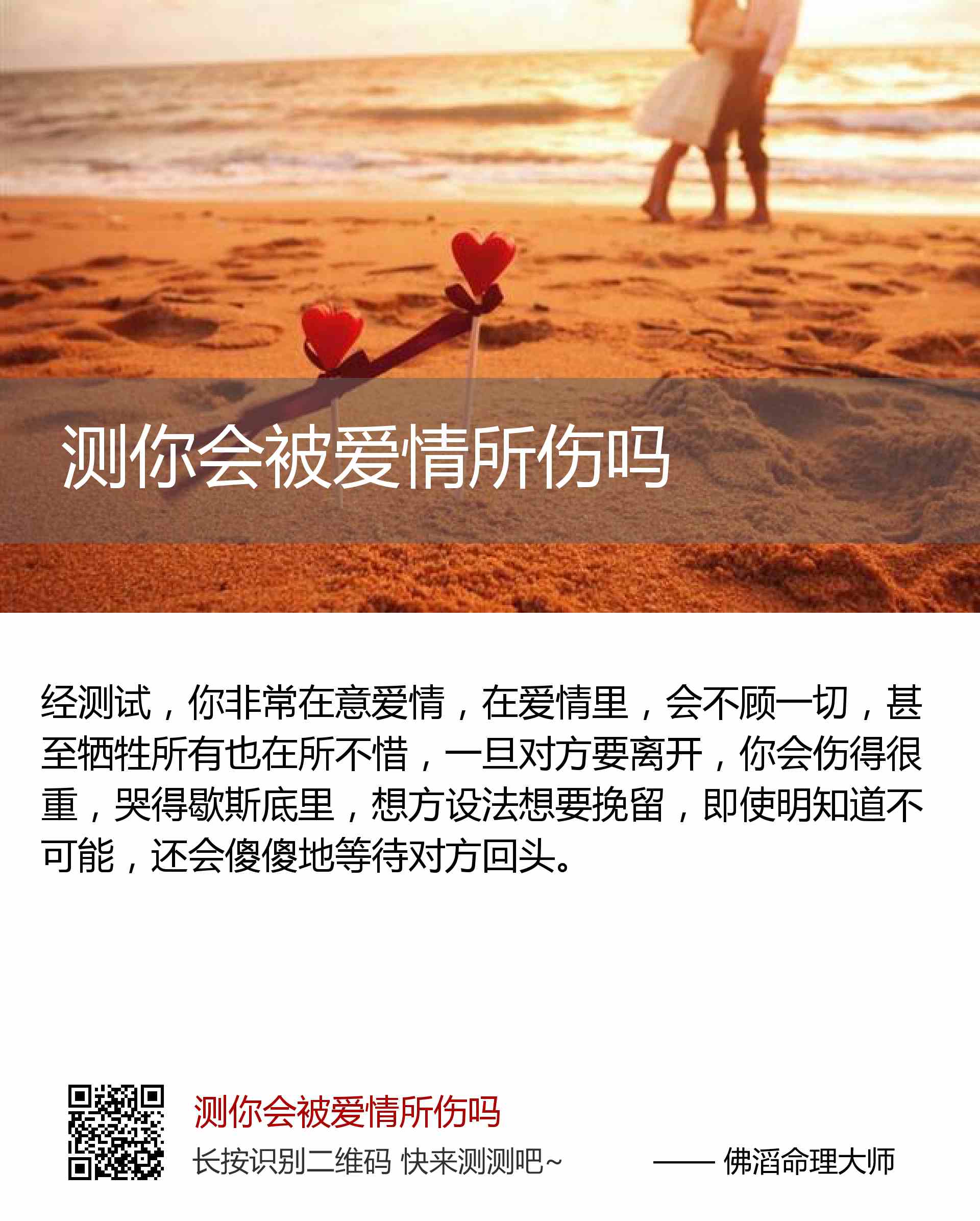 你非常在意爱情,在爱情里,会不顾一切,甚至牺牲所有也在所不惜,一旦对方要离开,你会伤得很重,哭得歇斯底里,想方设法想要挽留,即使明知道不可能,还会傻傻地等待对方回头。