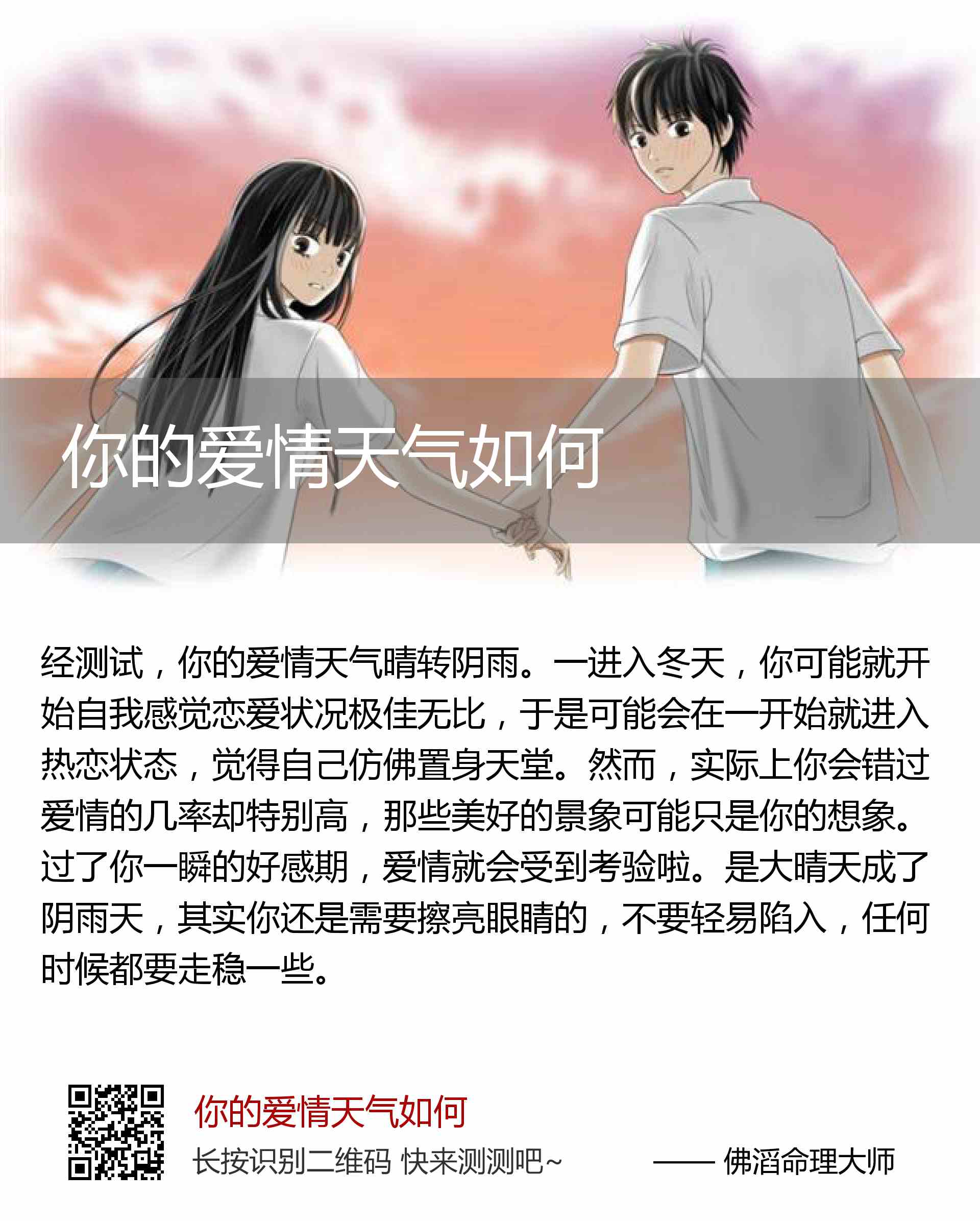 一进入冬天,你可能就开始自我感觉恋爱状况极佳无比,于是可能会在一开始就进入热恋状态,觉得自己仿佛置身天堂。然而,实际上你会错过爱情的几率却特别高,那些美好的景象可能只是你的想象。过了你一瞬的好感期,爱情就会受到考验啦。是大晴天成了阴雨天,其实你还是需要擦亮眼睛的,不要轻易陷入,任何时候都要走稳一些。