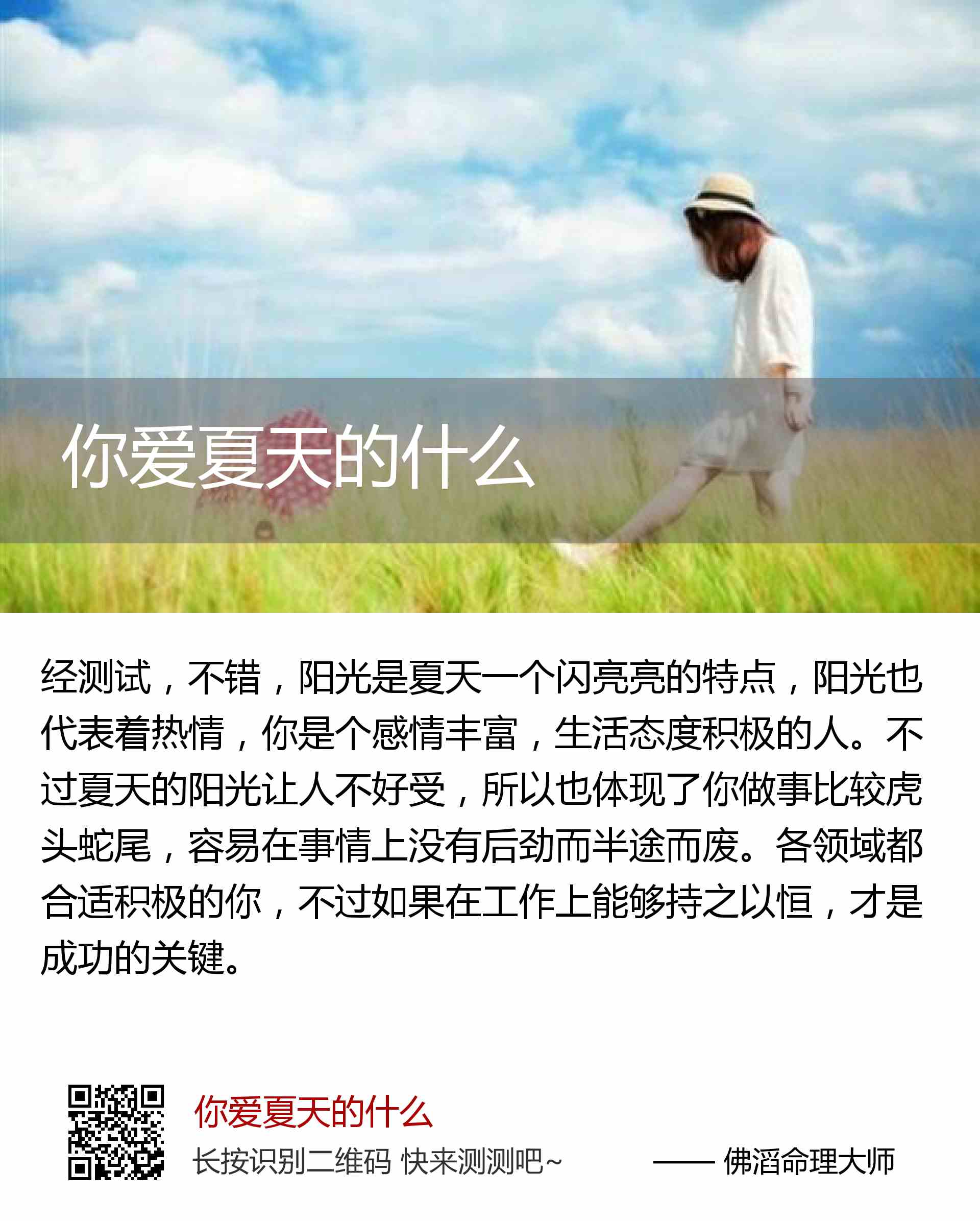 不过夏天的阳光让人不好受,所以也体现了你做事比较虎头蛇尾,容易在事情上没有后劲而半途而废。各领域都合适积极的你,不过如果在工作上能够持之以恒,才是成功的关键。