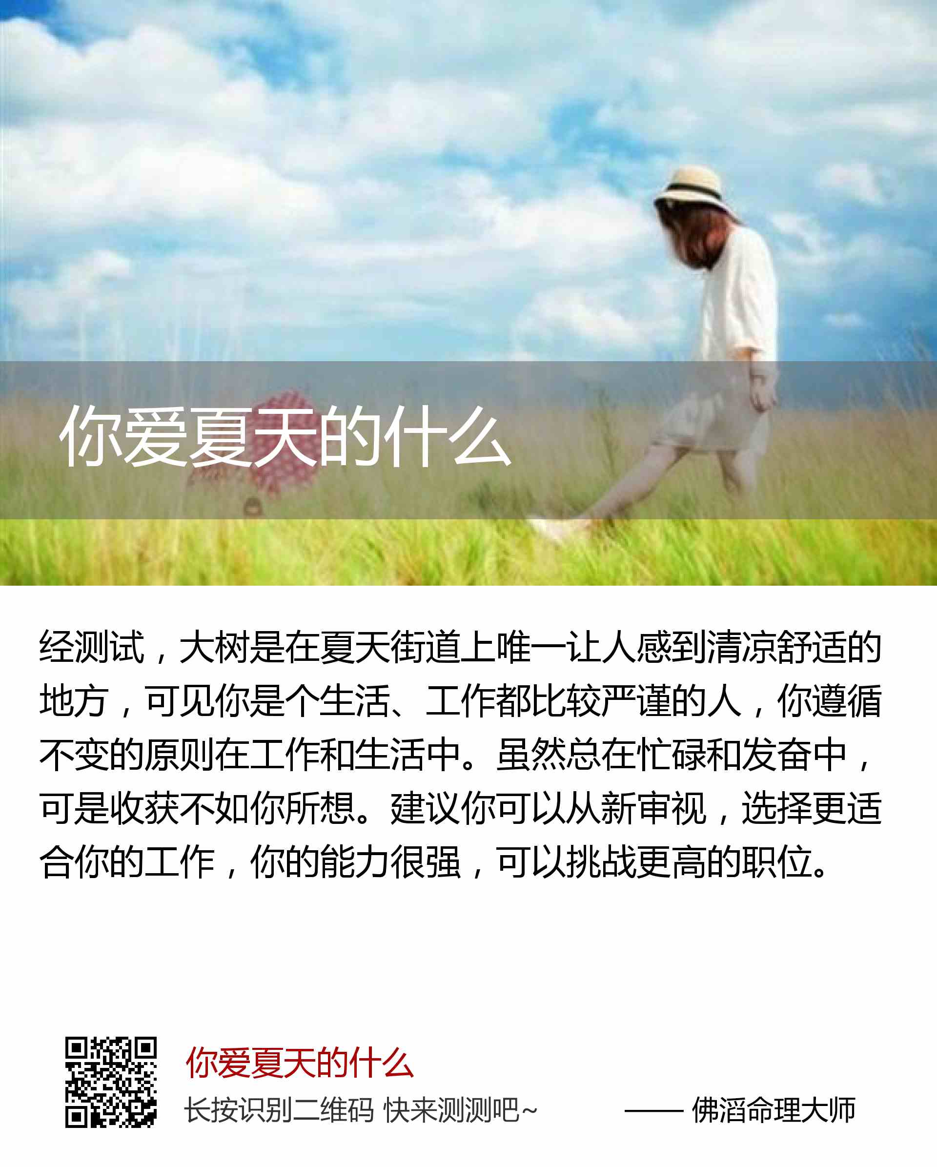 大树是在夏天街道上唯一让人感到清凉舒适的地方,可见你是个生活、工作都比较严谨的人,你遵循不变的原则在工作和生活中。