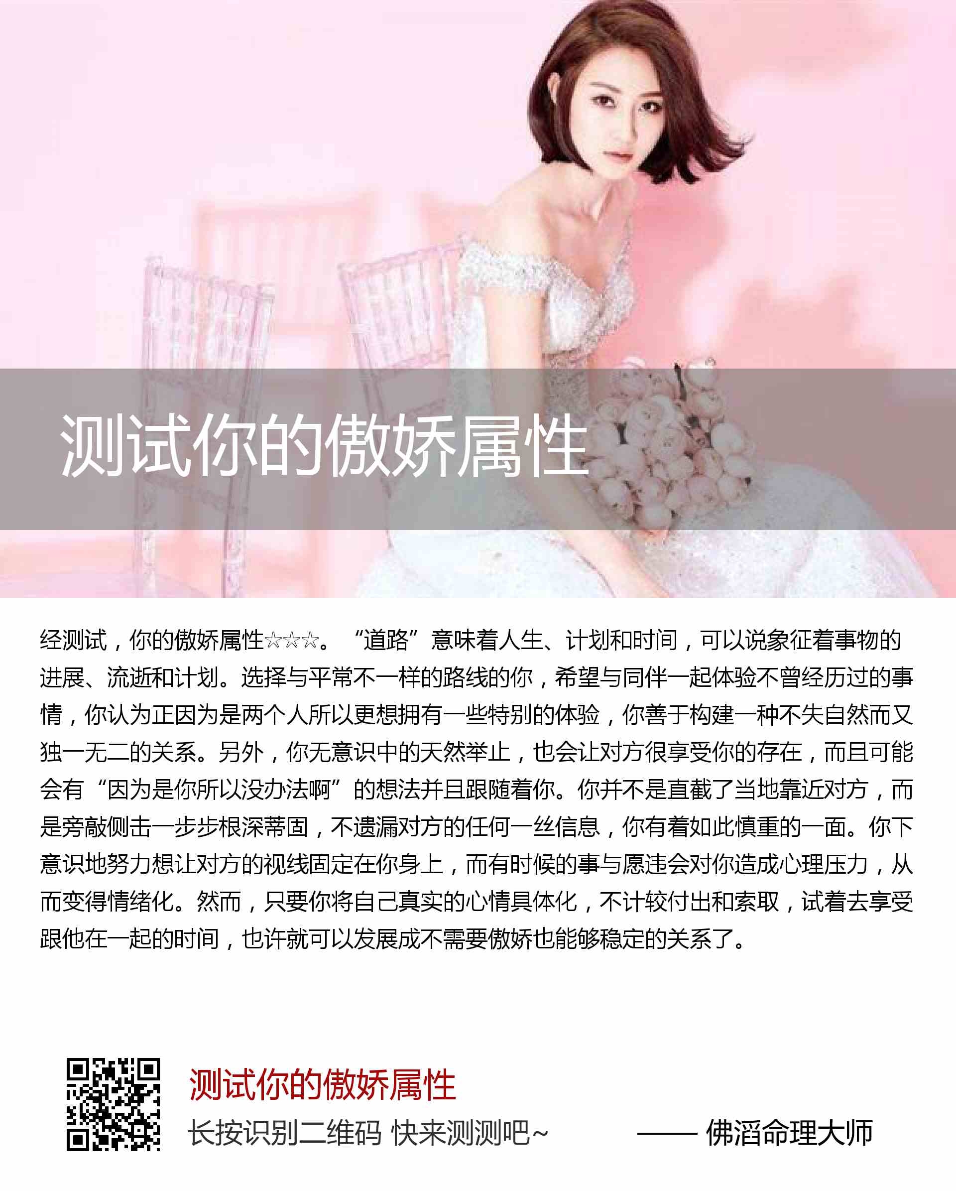 “道路”意味着人生、计划和时间,可以说象征着事物的进展、流逝和计划。选择与平常不一样的路线的你,希望与同伴一起体验不曾经历过的事情,你认为正因为是两个人所以更想拥有一些特别的体验,你善于构建一种不失自然而又独一无二的关系。另外,你无意识中的天然举止,也会让对方很享受你的存在,而且可能会有“因为是你所以没办法啊”的想法并且跟随着你。你并不是直截了当地靠近对方,而是旁敲侧击一步步根深蒂固,不遗漏对方的任何一丝信息,你有着如此慎重的一面。你下意识地努力想让对方的视线固定在你身上,而有时候的事与愿违会对你造成心理压力,从而变得情绪化。然而,只要你将自己真实的心情具体化,不计较付出和索取,试着去享受跟他在一起的时间,也许就可以发展成不需要傲娇也能够稳定的关系了。
