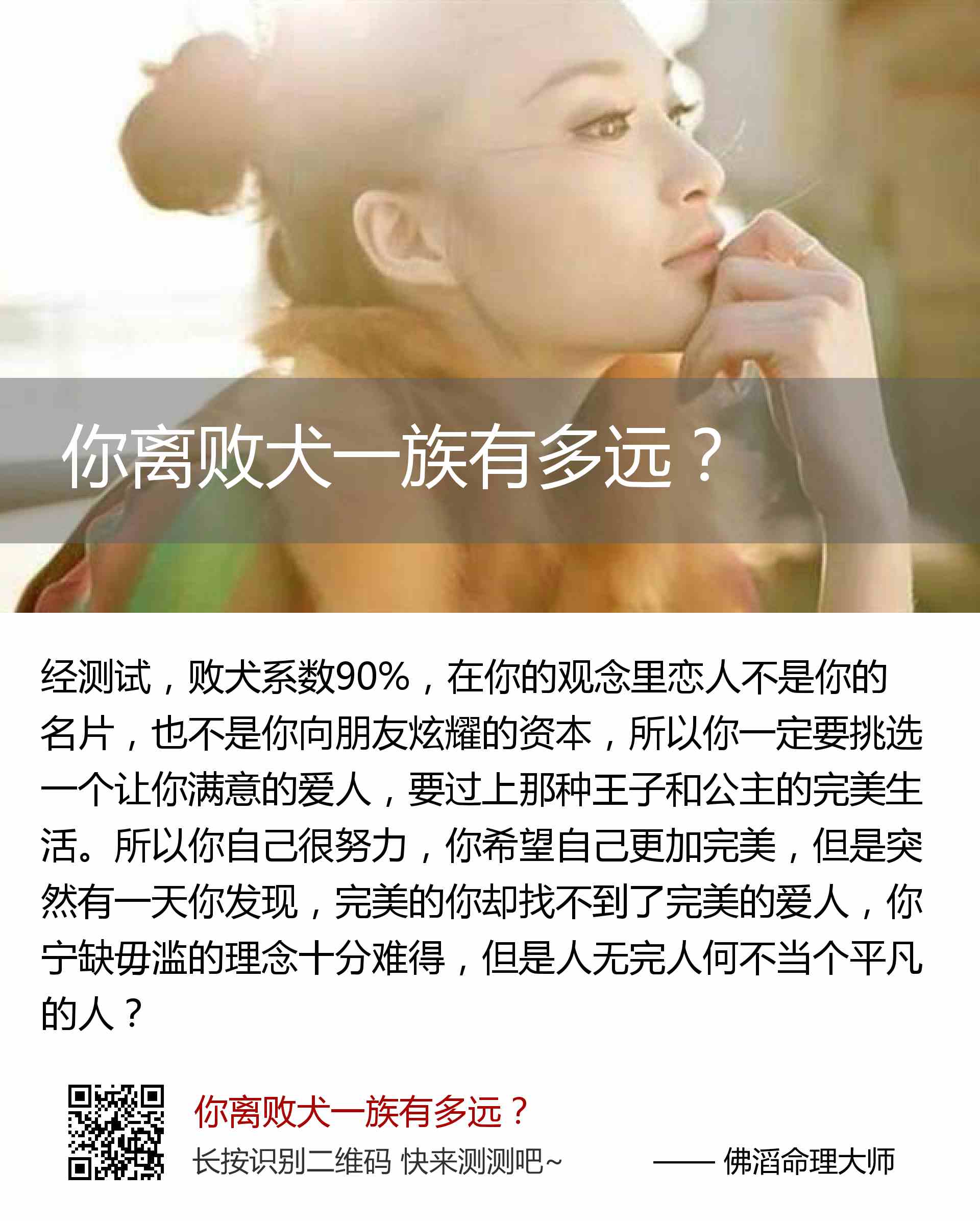 败犬系数90%,在你的观念里恋人不是你的名片,也不是你向朋友炫耀的资本,所以你一定要挑选一个让你满意的爱人,要过上那种王子和公主的完美生活。