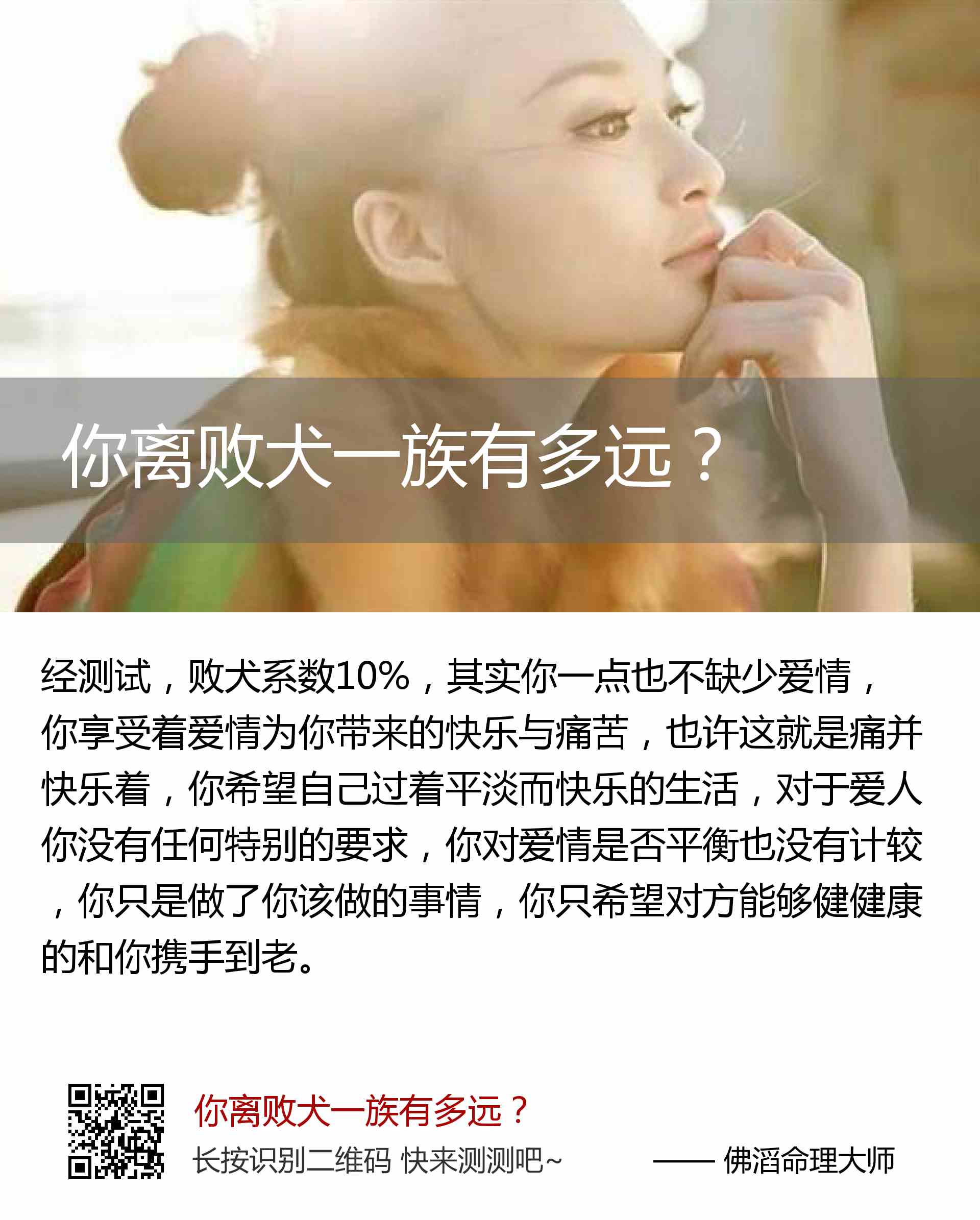 败犬系数10%,其实你一点也不缺少爱情,你享受着爱情为你带来的快乐与痛苦,也许这就是痛并快乐着,你希望自己过着平淡而快乐的生活,对于爱人你没有任何特别的要求,你对爱情是否平衡也没有计较,你只是做了你该做的事情,你只希望对方能够健健康的和你携手到老。