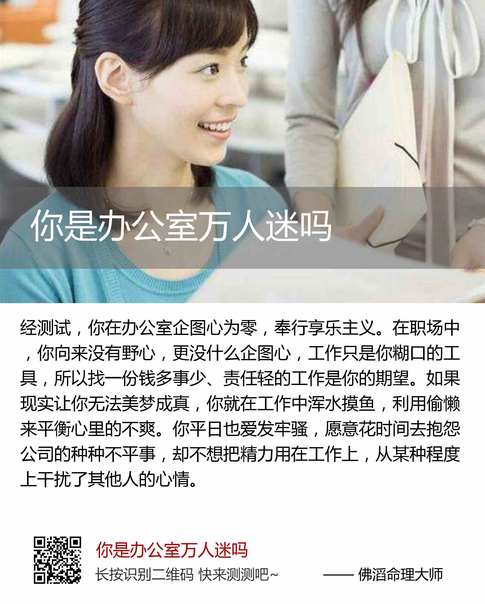 在职场中,你向来没有野心,更没什么企图心,工作只是你糊口的工具,所以找一份钱多事少、责任轻的工作是你的期望。如果现实让你无法美梦成真,你就在工作中浑水摸鱼,利用偷懒来平衡心里的不爽。你平日也爱发牢骚,愿意花时间去抱怨公司的种种不平事,却不想把精力用在工作上,从某种程度上干扰了其他人的心情。