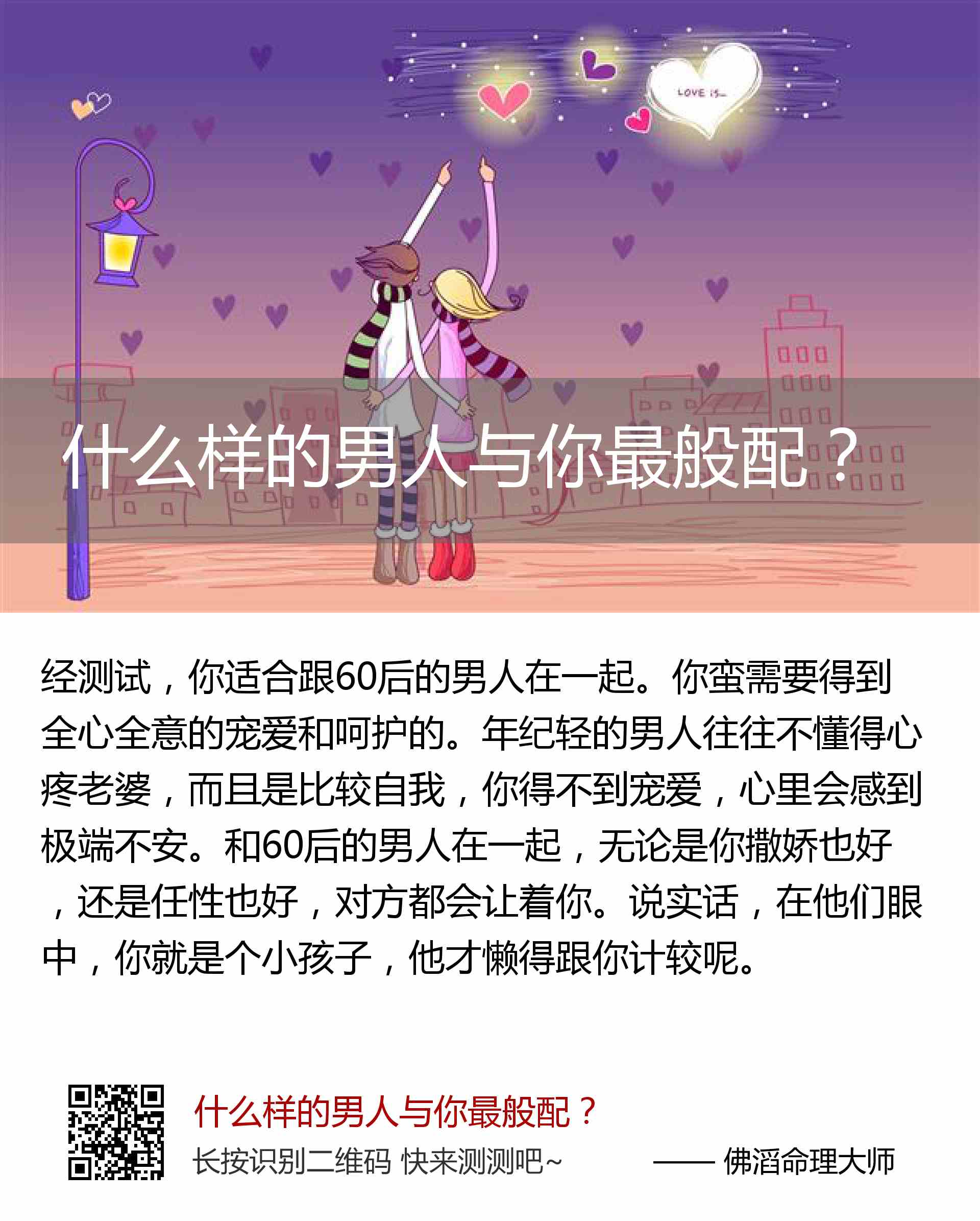 你蛮需要得到全心全意的宠爱和呵护的。年纪轻的男人往往不懂得心疼老婆,而且是比较自我,你得不到宠爱,心里会感到极端不安。和60后的男人在一起,无论是你撒娇也好,还是任性也好,对方都会让着你。说实话,在他们眼中,你就是个小孩子,他才懒得跟你计较呢。