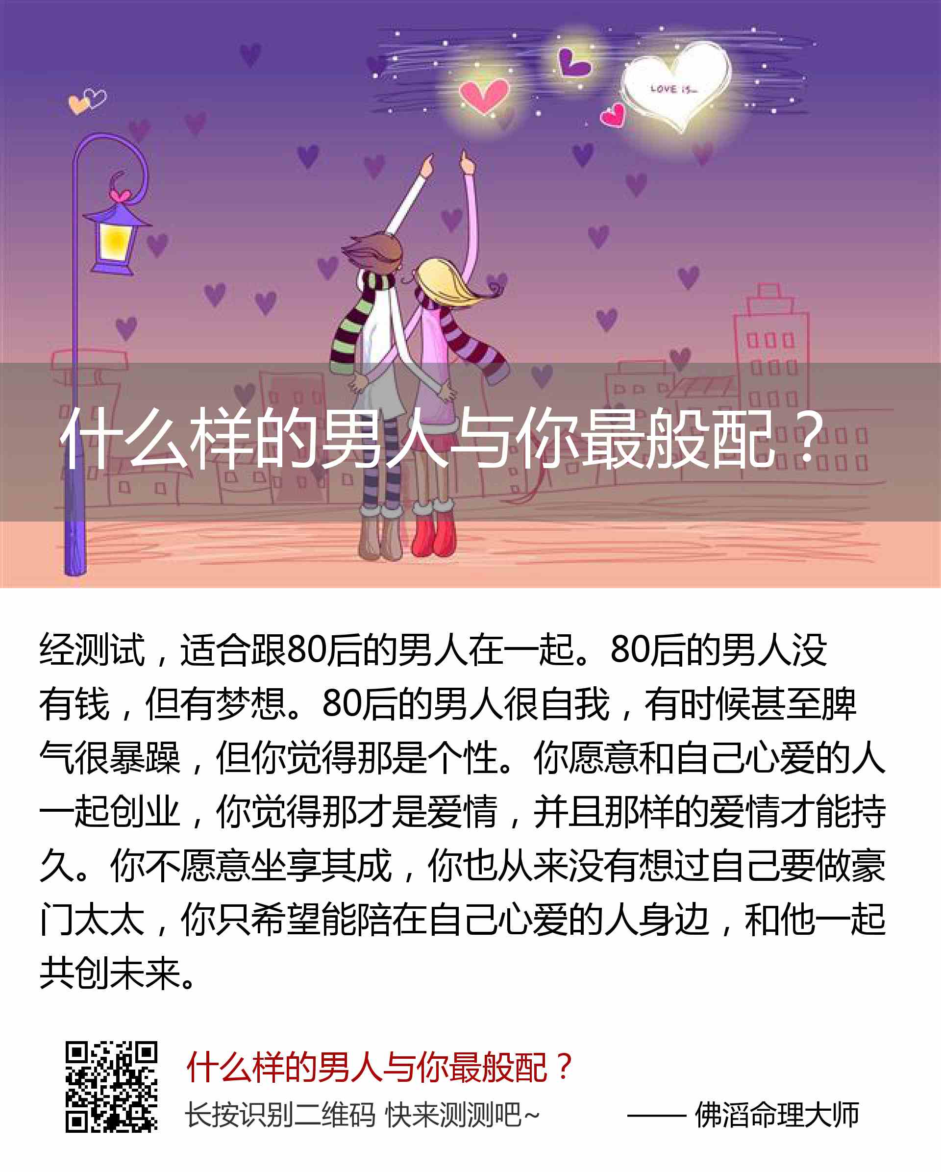 80后的男人没有钱,但有梦想。80后的男人很自我,有时候甚至脾气很暴躁,但你觉得那是个性。你愿意和自己心爱的人一起创业,你觉得那才是爱情,并且那样的爱情才能持久。你不愿意坐享其成,你也从来没有想过自己要做豪门太太,你只希望能陪在自己心爱的人身边,和他一起共创未来。