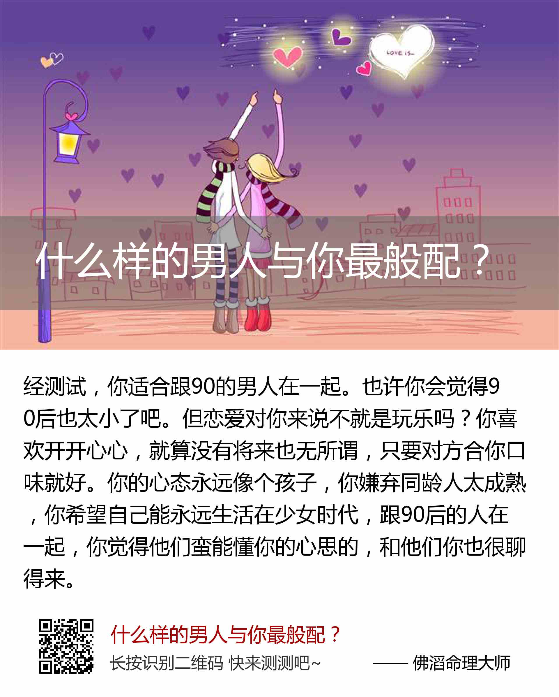 也许你会觉得90后也太小了吧。但恋爱对你来说不就是玩乐吗?你喜欢开开心心,就算没有将来也无所谓,只要对方合你口味就好。你的心态永远像个孩子,你嫌弃同龄人太成熟,你希望自己能永远生活在少女时代,跟90后的人在一起,你觉得他们蛮能懂你的心思的,和他们你也很聊得来。