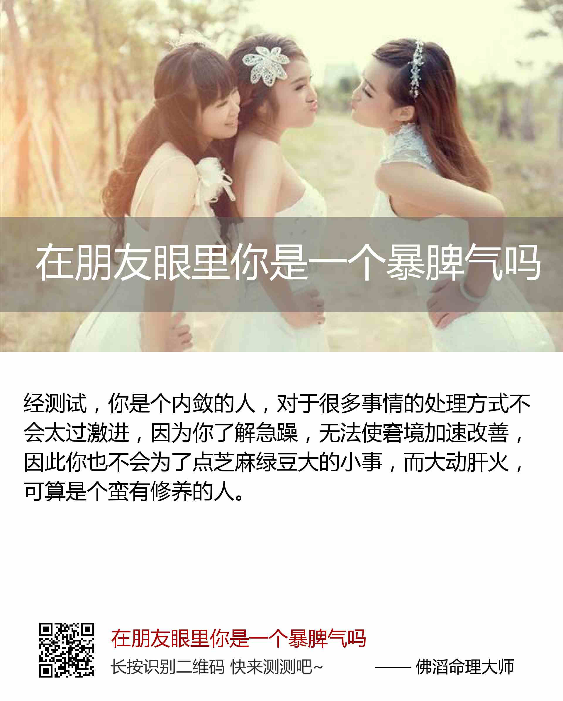 你是个内敛的人,对于很多事情的处理方式不会太过激进,因为你了解急躁,无法使窘境加速改善,因此你也不会为了点芝麻绿豆大的小事,而大动肝火,可算是个蛮有修养的人。