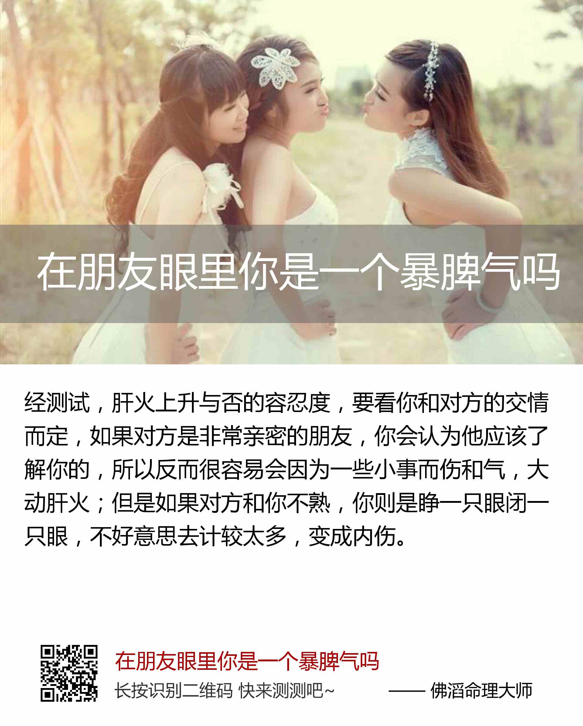肝火上升与否的容忍度,要看你和对方的交情而定,如果对方是非常亲密的朋友,你会认为他应该了解你的,所以反而很容易会因为一些小事而伤和气,大动肝火;但是如果对方和你不熟,你则是睁一只眼闭一只眼,不好意思去计较太多,变成内伤。