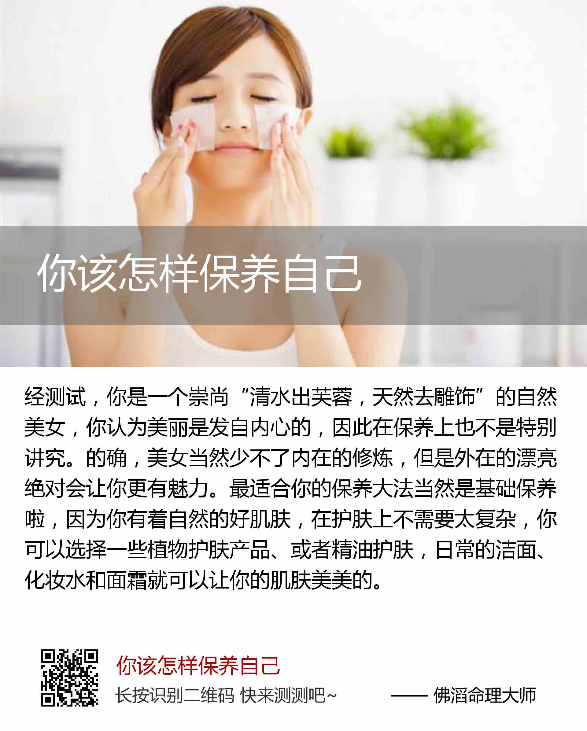的确,美女当然少不了内在的修炼,但是外在的漂亮绝对会让你更有魅力。最适合你的保养大法当然是基础保养啦,因为你有着自然的好肌肤,在护肤上不需要太复杂,你可以选择一些植物护肤产品、或者精油护肤,日常的洁面、化妆水和面霜就可以让你的肌肤美美的。