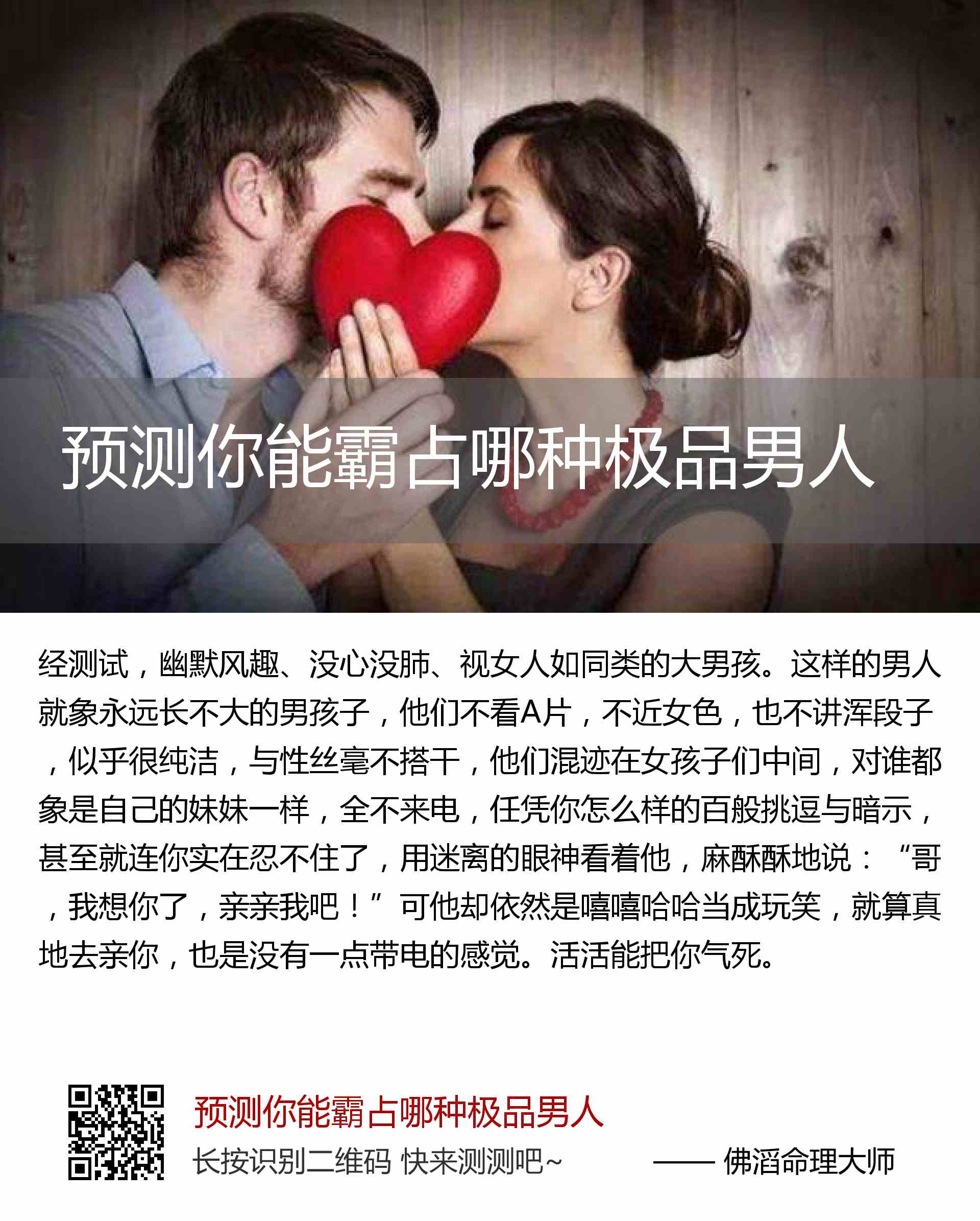 这样的男人就象永远长不大的男孩子,他们不看A片,不近女色,也不讲浑段子,似乎很纯洁,与性丝毫不搭干,他们混迹在女孩子们中间,对谁都象是自己的妹妹一样,全不来电,任凭你怎么样的百般挑逗与暗示,甚至就连你实在忍不住了,用迷离的眼神看着他,麻酥酥地说:“哥,我想你了,亲亲我吧!”可他却依然是嘻嘻哈哈当成玩笑,就算真地去亲你,也是没有一点带电的感觉。活活能把你气死。