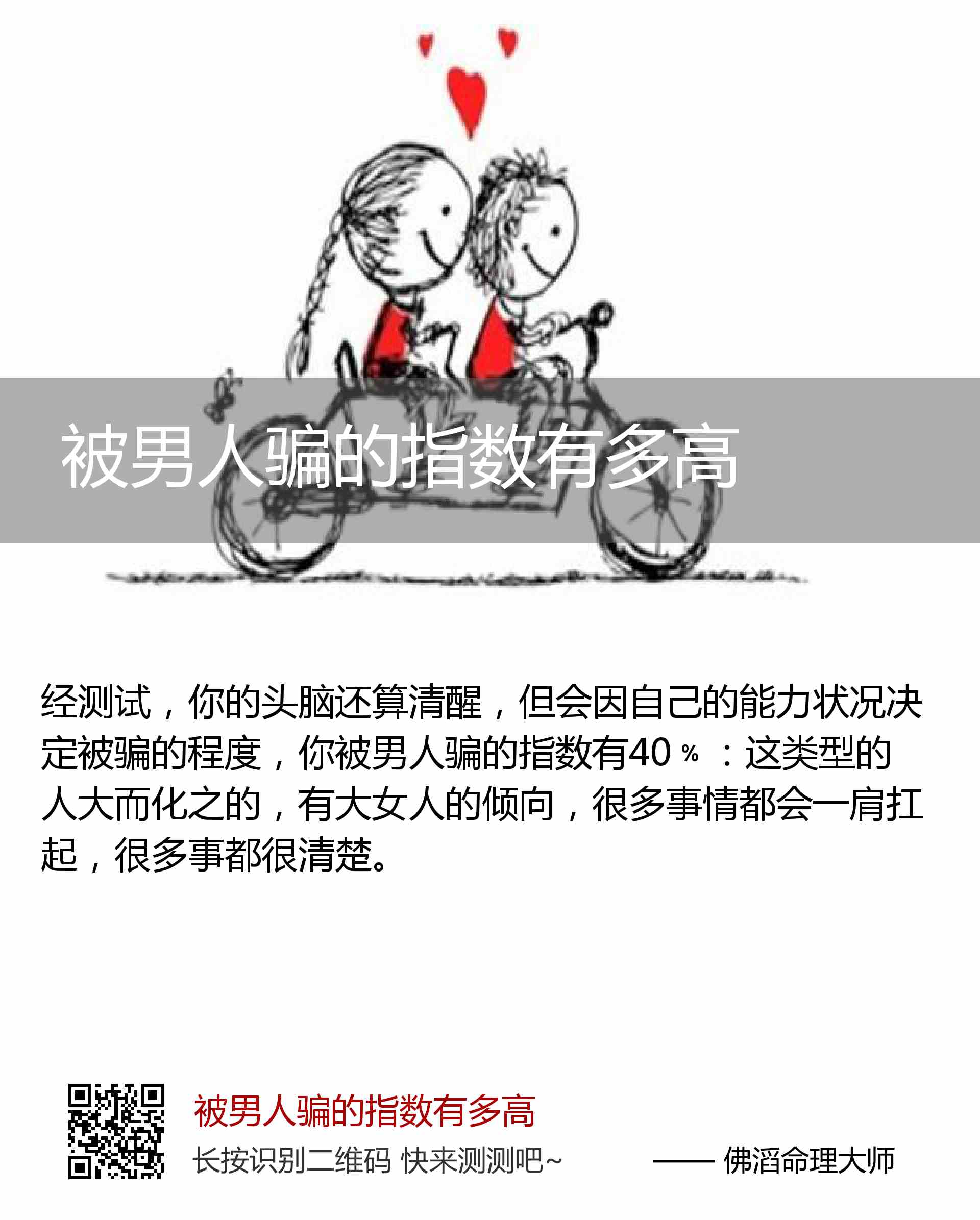 你的头脑还算清醒,但会因自己的能力状况决定被骗的程度,你被男人骗的指数有40﹪:这类型的人大而化之的,有大女人的倾向,很多事情都会一肩扛起,很多事都很清楚。