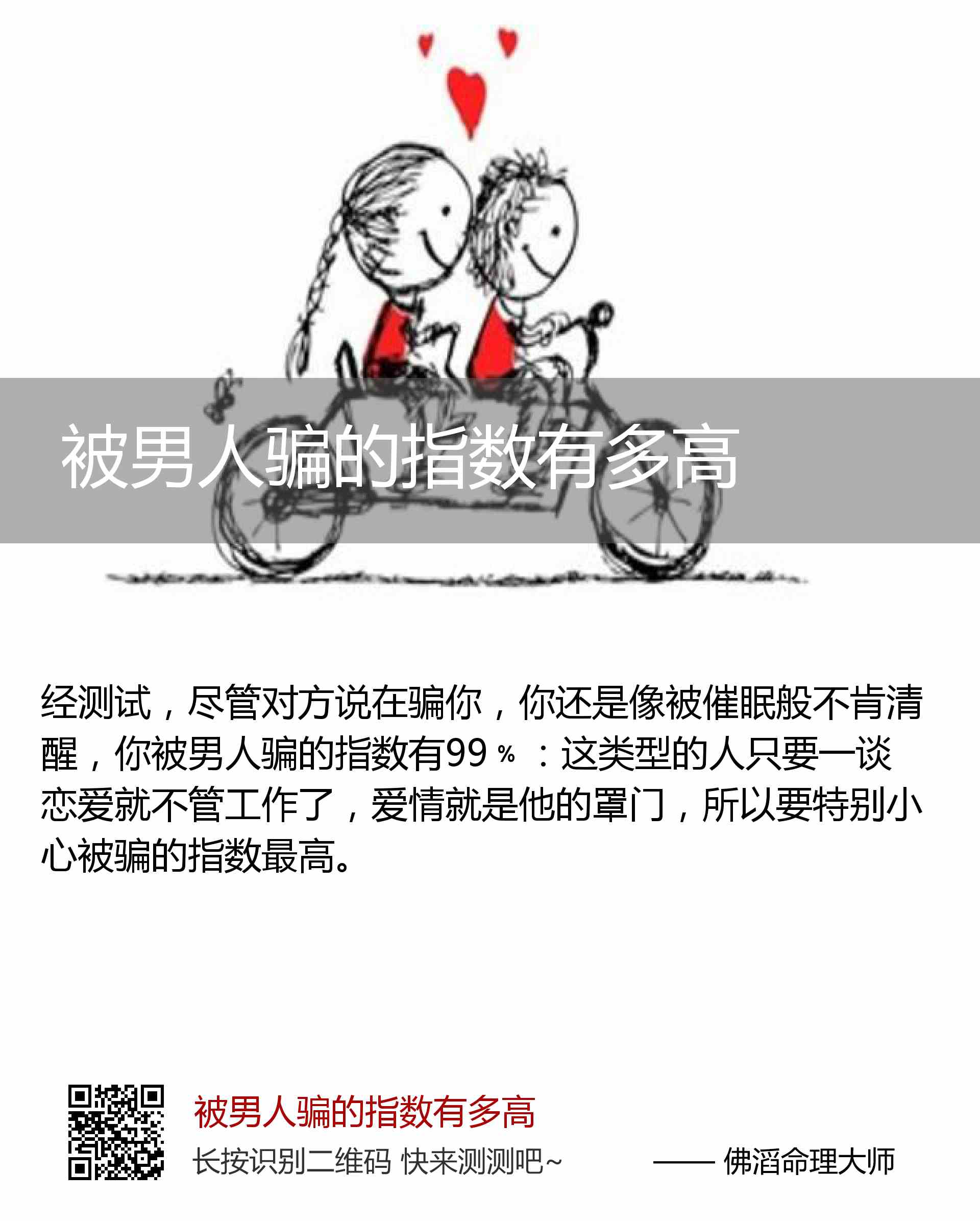 尽管对方说在骗你,你还是像被催眠般不肯清醒,你被男人骗的指数有99﹪:这类型的人只要一谈恋爱就不管工作了,爱情就是他的罩门,所以要特别小心被骗的指数最高。