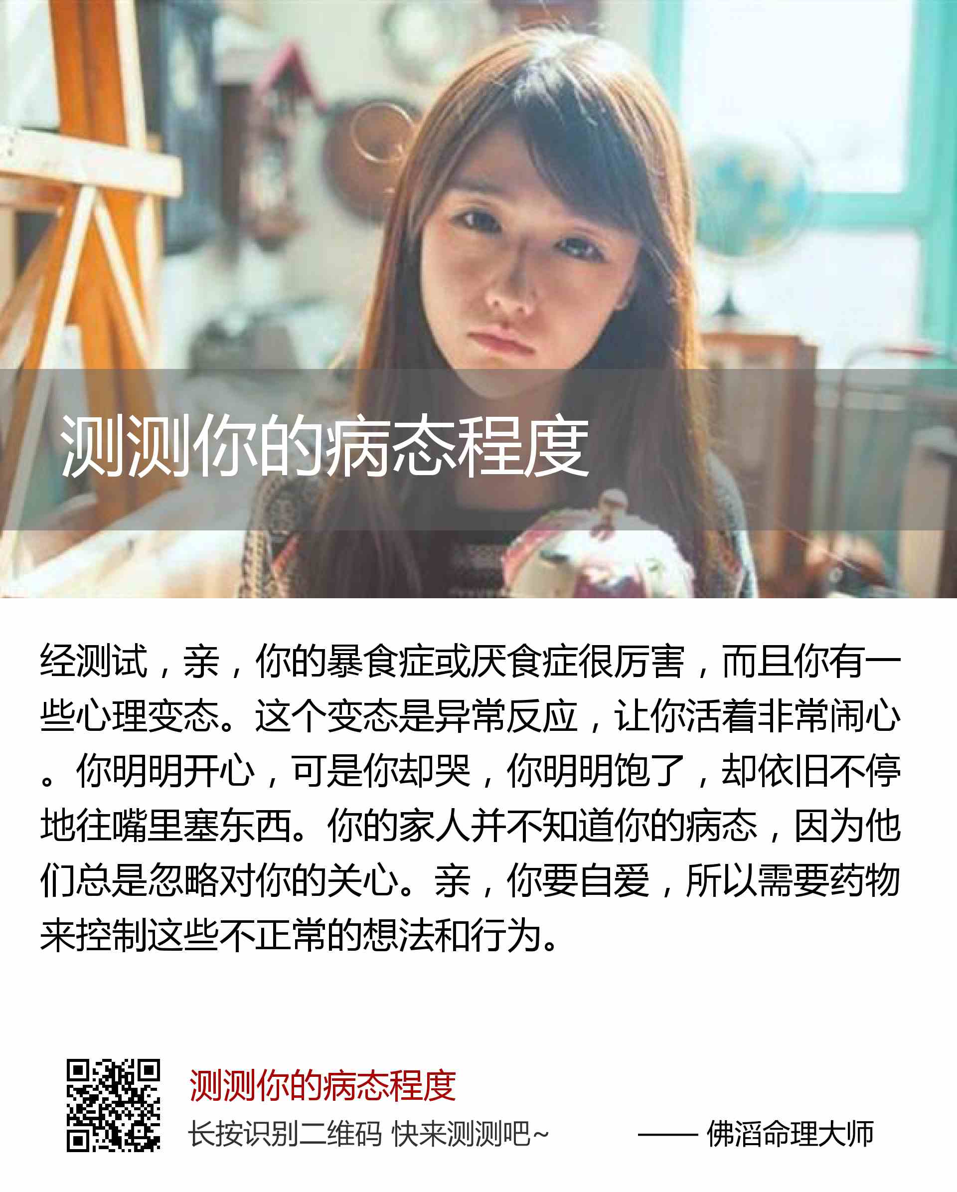 亲,你的暴食症或厌食症很厉害,而且你有一些心理变态。