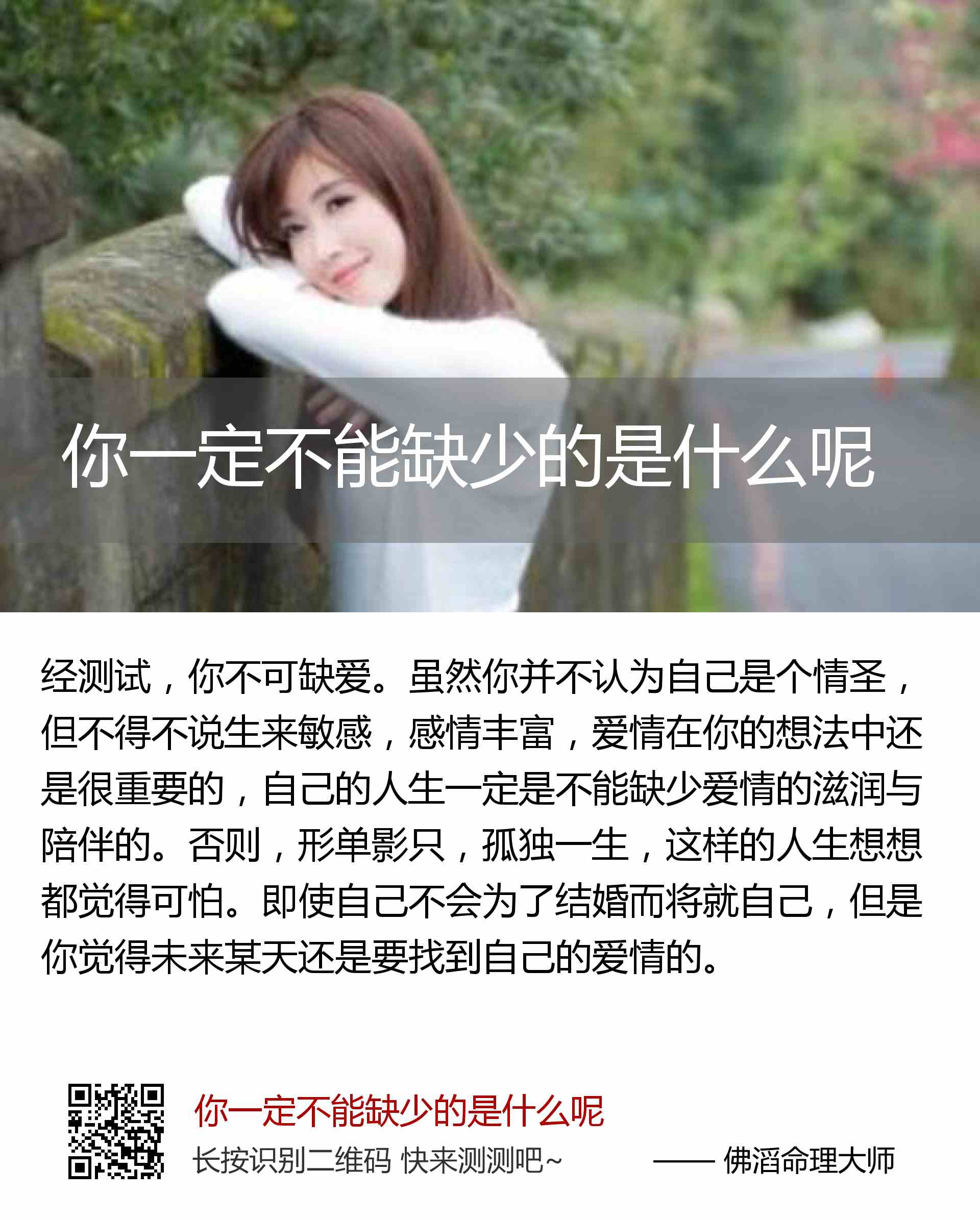 虽然你并不认为自己是个情圣,但不得不说生来敏感,感情丰富,爱情在你的想法中还是很重要的,自己的人生一定是不能缺少爱情的滋润与陪伴的。否则,形单影只,孤独一生,这样的人生想想都觉得可怕。即使自己不会为了结婚而将就自己,但是你觉得未来某天还是要找到自己的爱情的。