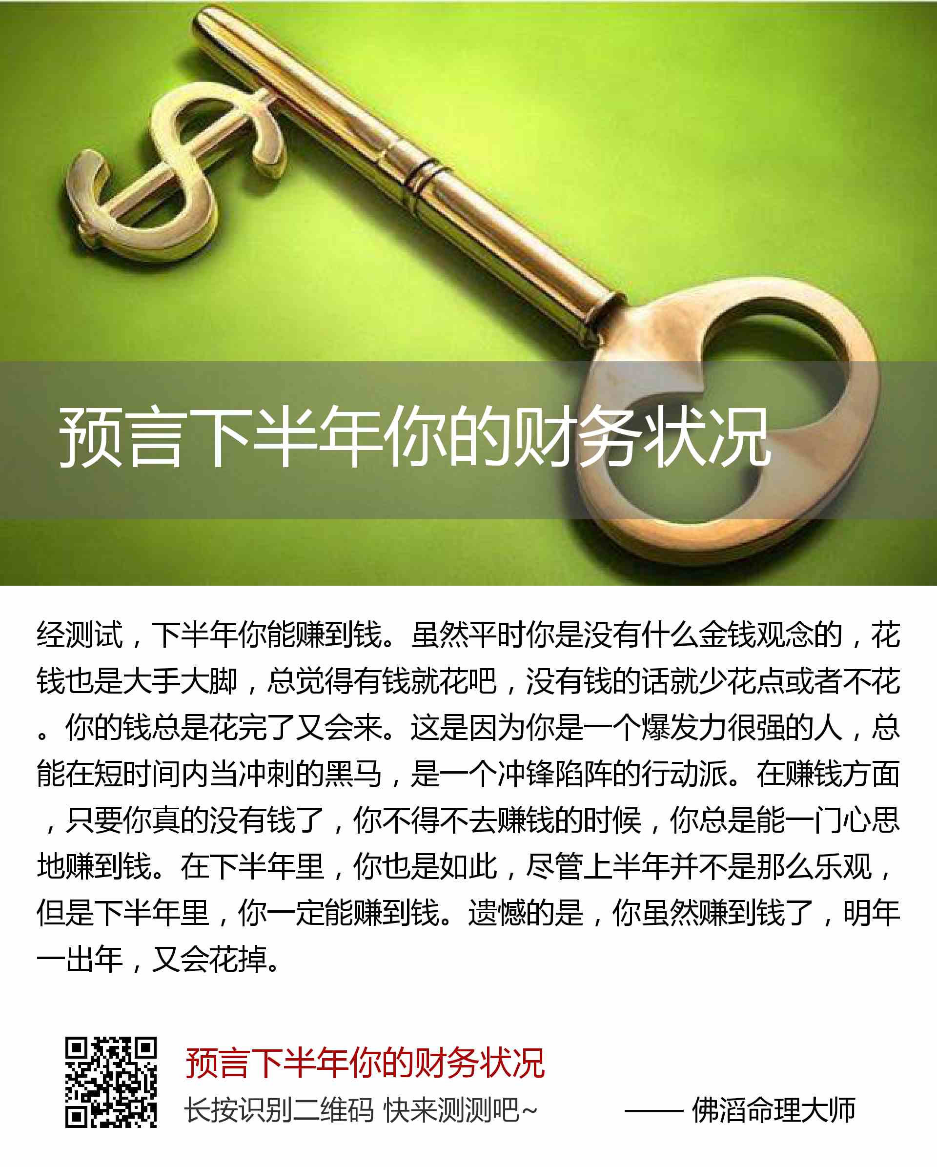 虽然平时你是没有什么金钱观念的,花钱也是大手大脚,总觉得有钱就花吧,没有钱的话就少花点或者不花。你的钱总是花完了又会来。这是因为你是一个爆发力很强的人,总能在短时间内当冲刺的黑马,是一个冲锋陷阵的行动派。在赚钱方面,只要你真的没有钱了,你不得不去赚钱的时候,你总是能一门心思地赚到钱。在下半年里,你也是如此,尽管上半年并不是那么乐观,但是下半年里,你一定能赚到钱。遗憾的是,你虽然赚到钱了,明年一出年,又会花掉。