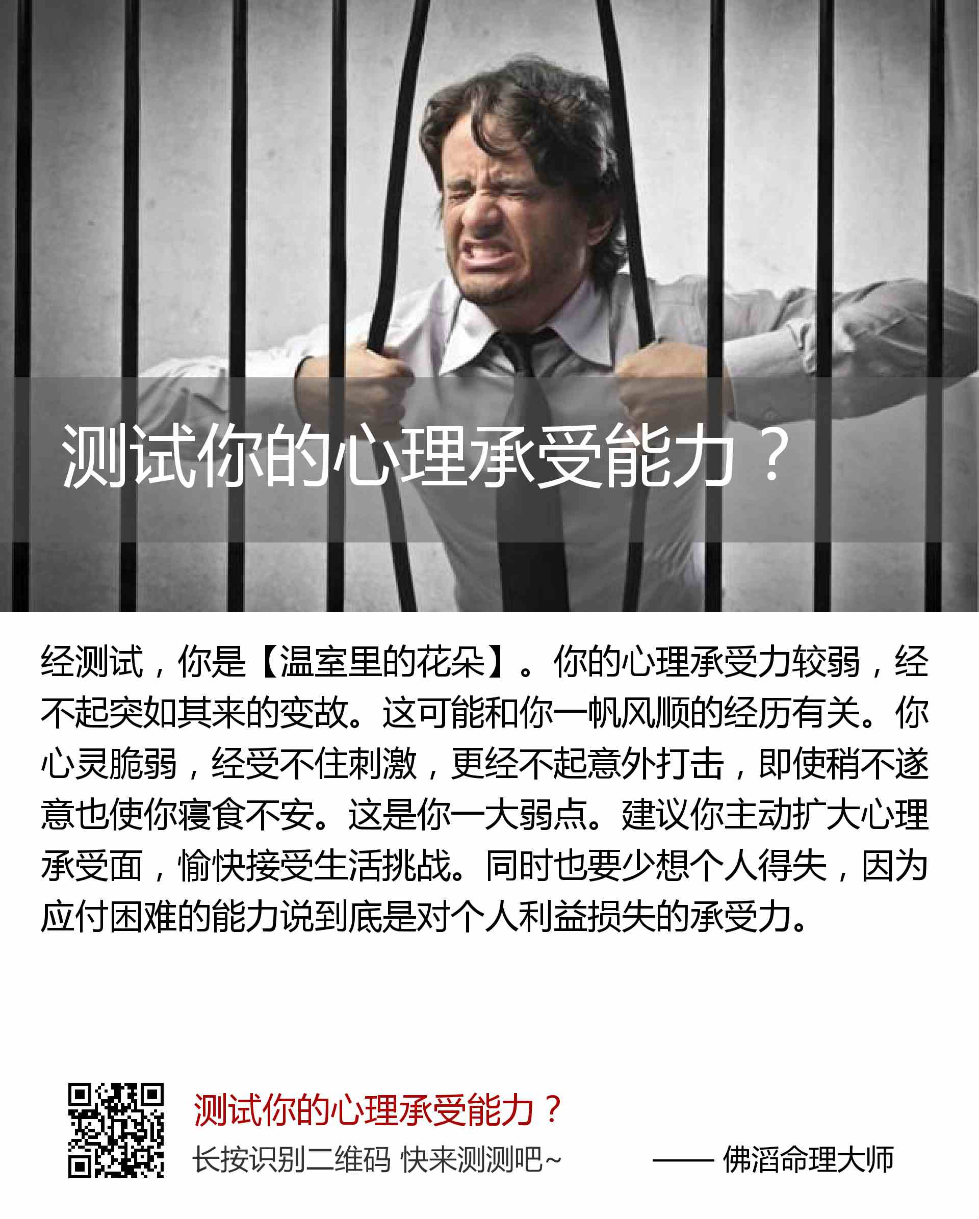 你的心理承受力较弱,经不起突如其来的变故。这可能和你一帆风顺的经历有关。你心灵脆弱,经受不住刺激,更经不起意外打击,即使稍不遂意也使你寝食不安。这是你一大弱点。建议你主动扩大心理承受面,愉快接受生活挑战。同时也要少想个人得失,因为应付困难的能力说到底是对个人利益损失的承受力。