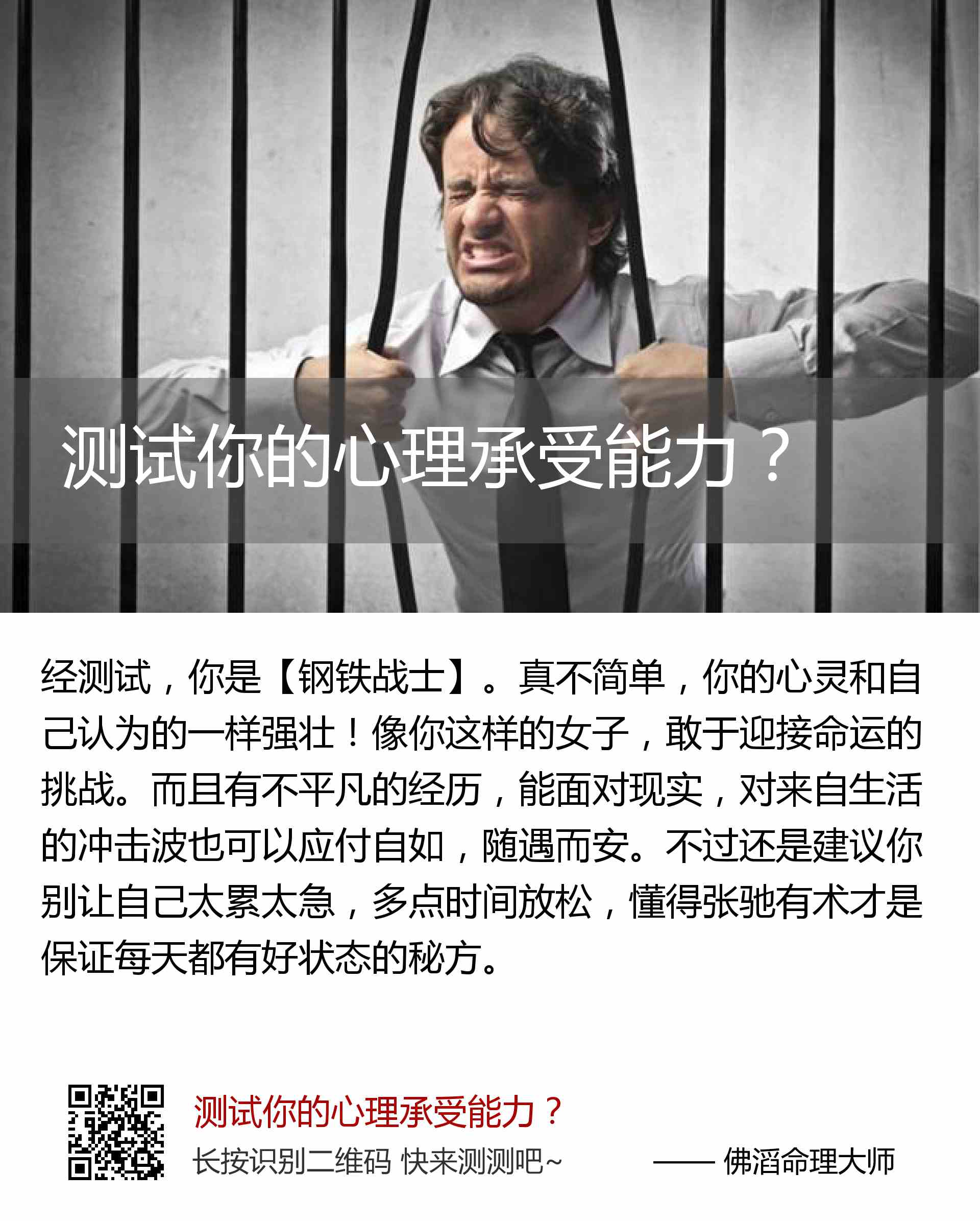 真不简单,你的心灵和自己认为的一样强壮!像你这样的女子,敢于迎接命运的挑战。而且有不平凡的经历,能面对现实,对来自生活的冲击波也可以应付自如,随遇而安。不过还是建议你别让自己太累太急,多点时间放松,懂得张驰有术才是保证每天都有好状态的秘方。