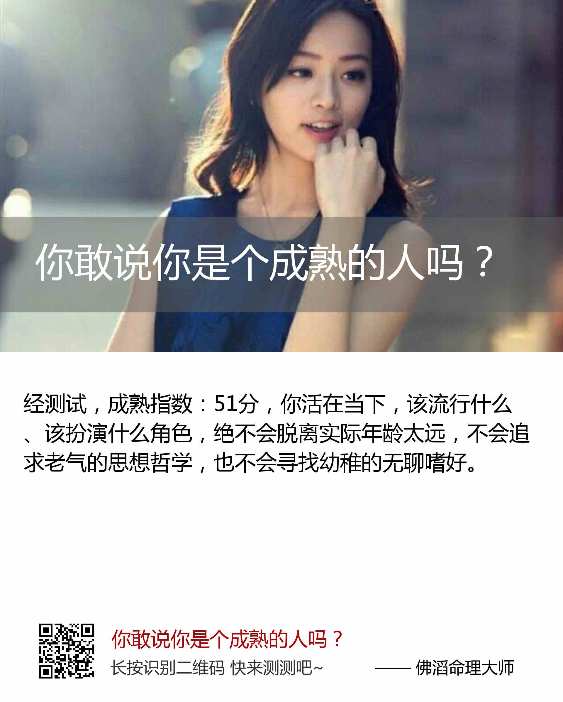 成熟指数:51分,你活在当下,该流行什么、该扮演什么角色,绝不会脱离实际年龄太远,不会追求老气的思想哲学,也不会寻找幼稚的无聊嗜好。