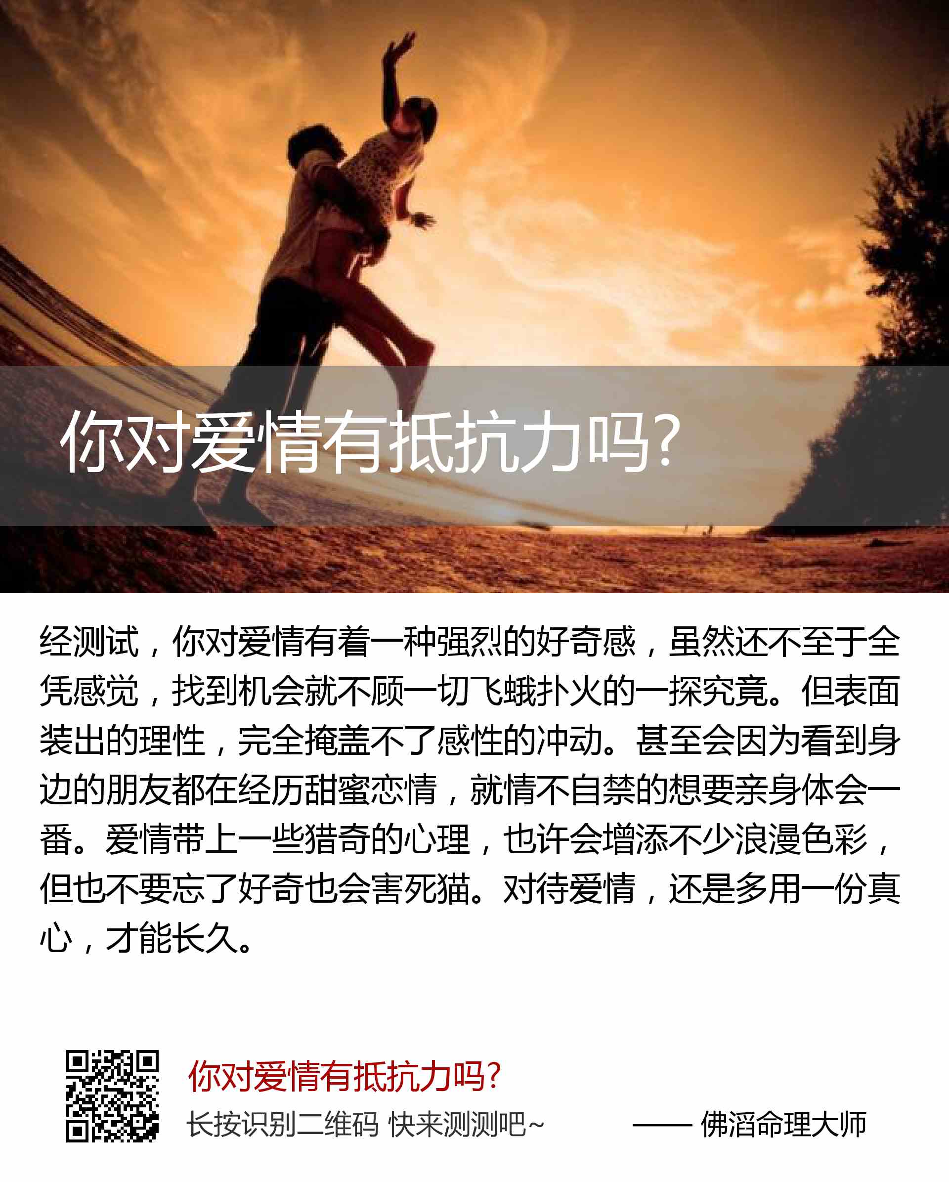 你对爱情有着一种强烈的好奇感,虽然还不至于全凭感觉,找到机会就不顾一切飞蛾扑火的一探究竟。