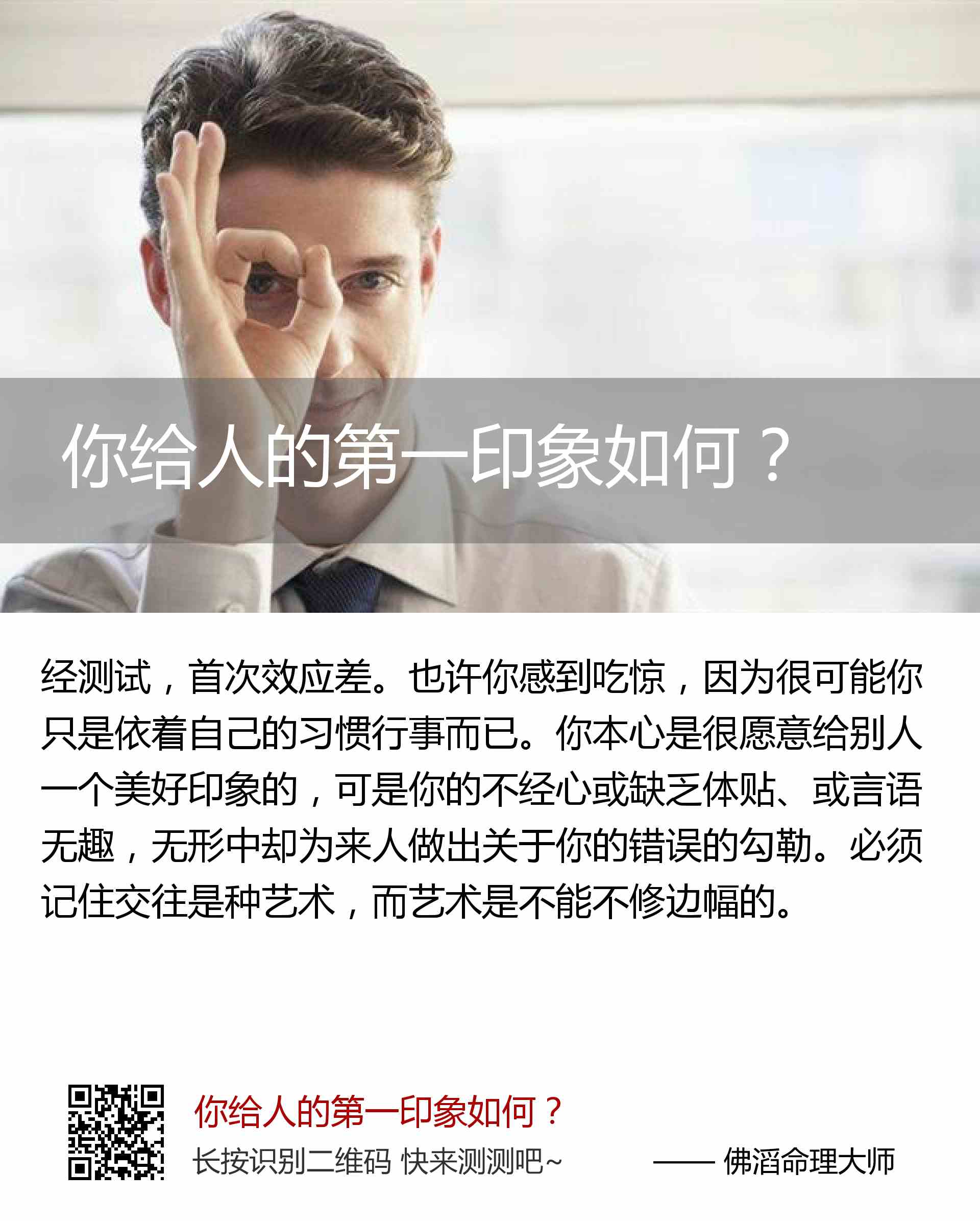 也许你感到吃惊,因为很可能你只是依着自己的习惯行事而已。你本心是很愿意给别人一个美好印象的,可是你的不经心或缺乏体贴、或言语无趣,无形中却为来人做出关于你的错误的勾勒。必须记住交往是种艺术,而艺术是不能不修边幅的。
