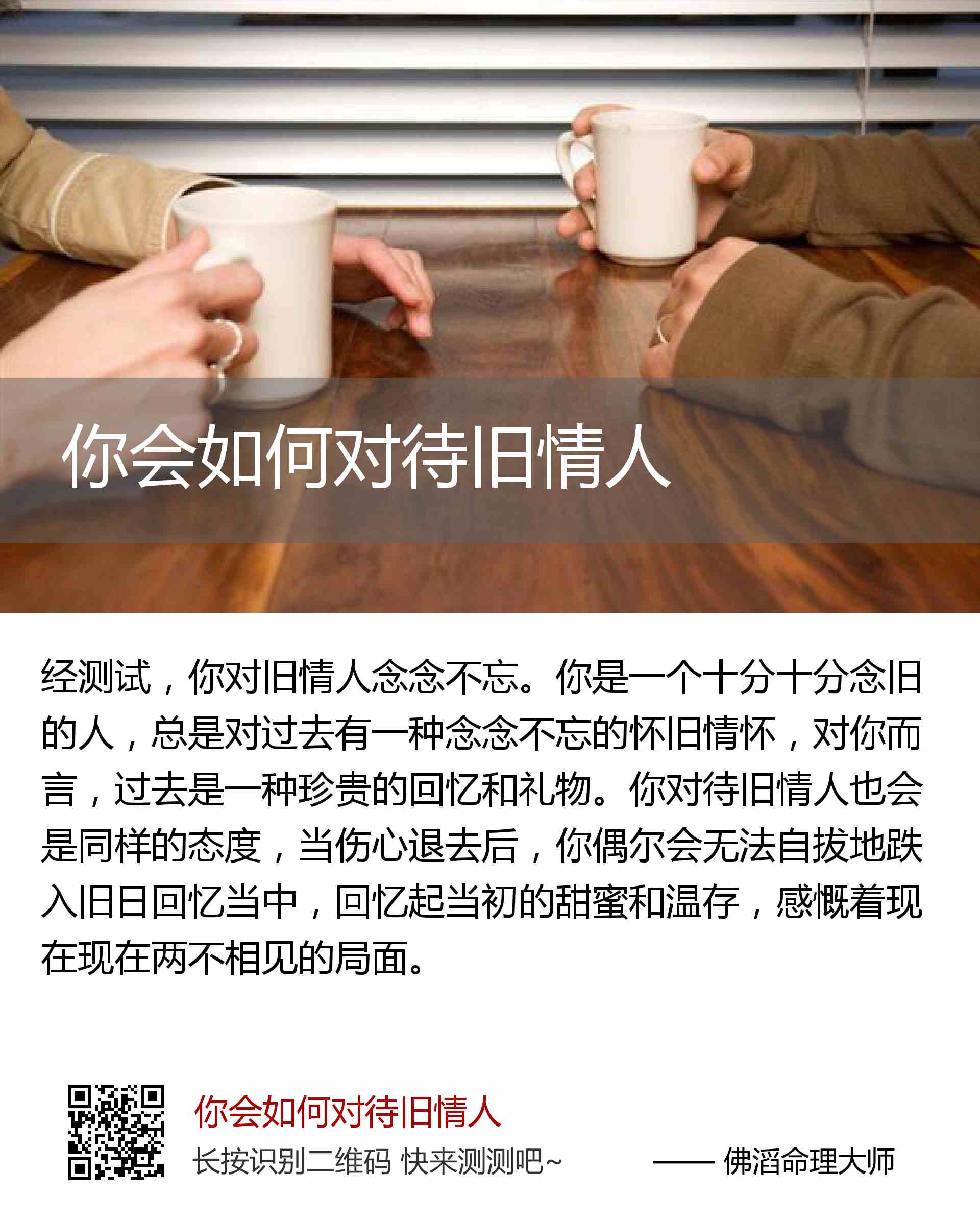 你是一个十分十分念旧的人,总是对过去有一种念念不忘的怀旧情怀,对你而言,过去是一种珍贵的回忆和礼物。你对待旧情人也会是同样的态度,当伤心退去后,你偶尔会无法自拔地跌入旧日回忆当中,回忆起当初的甜蜜和温存,感慨着现在现在两不相见的局面。