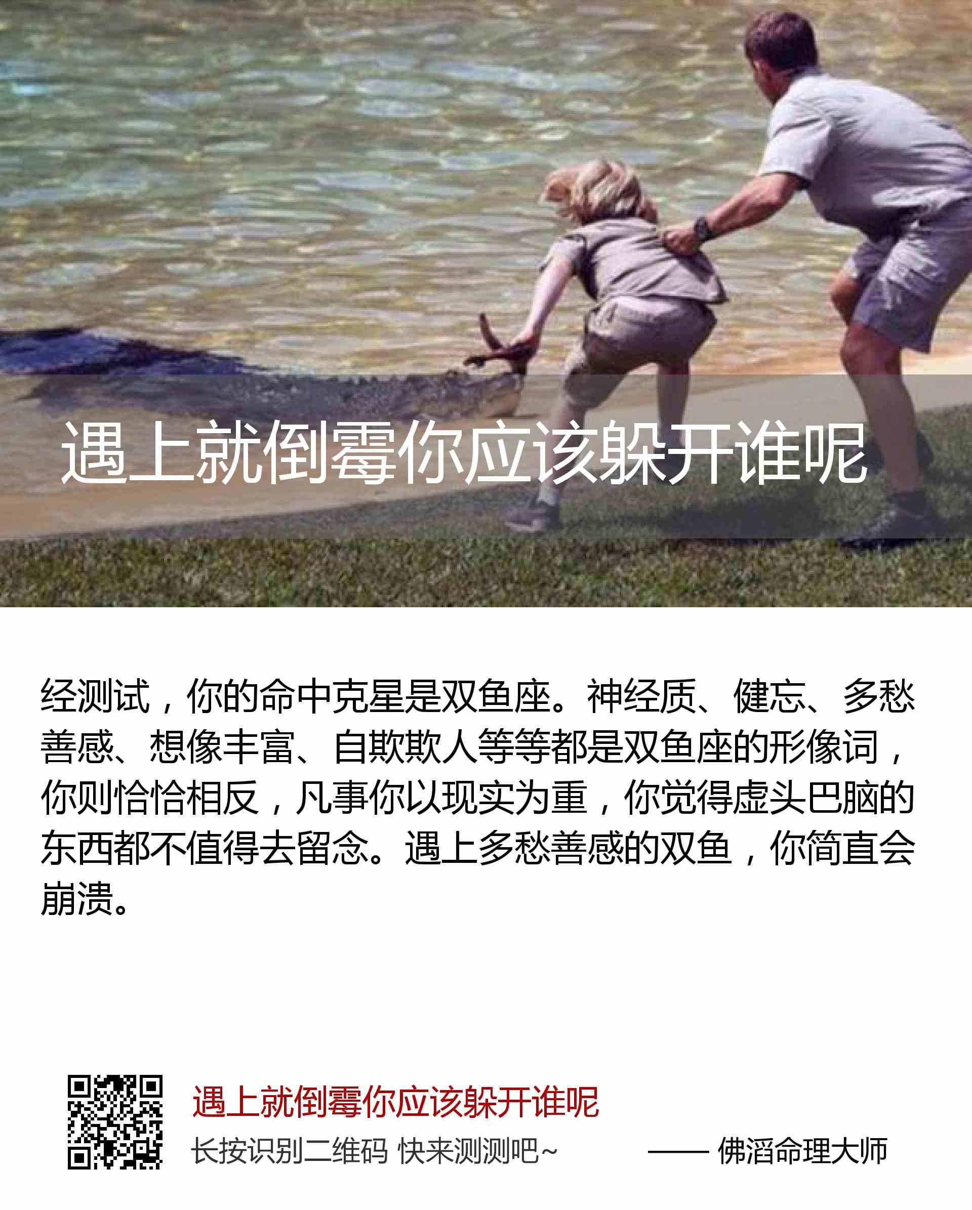 神经质、健忘、多愁善感、想像丰富、自欺欺人等等都是双鱼座的形像词,你则恰恰相反,凡事你以现实为重,你觉得虚头巴脑的东西都不值得去留念。遇上多愁善感的双鱼,你简直会崩溃。