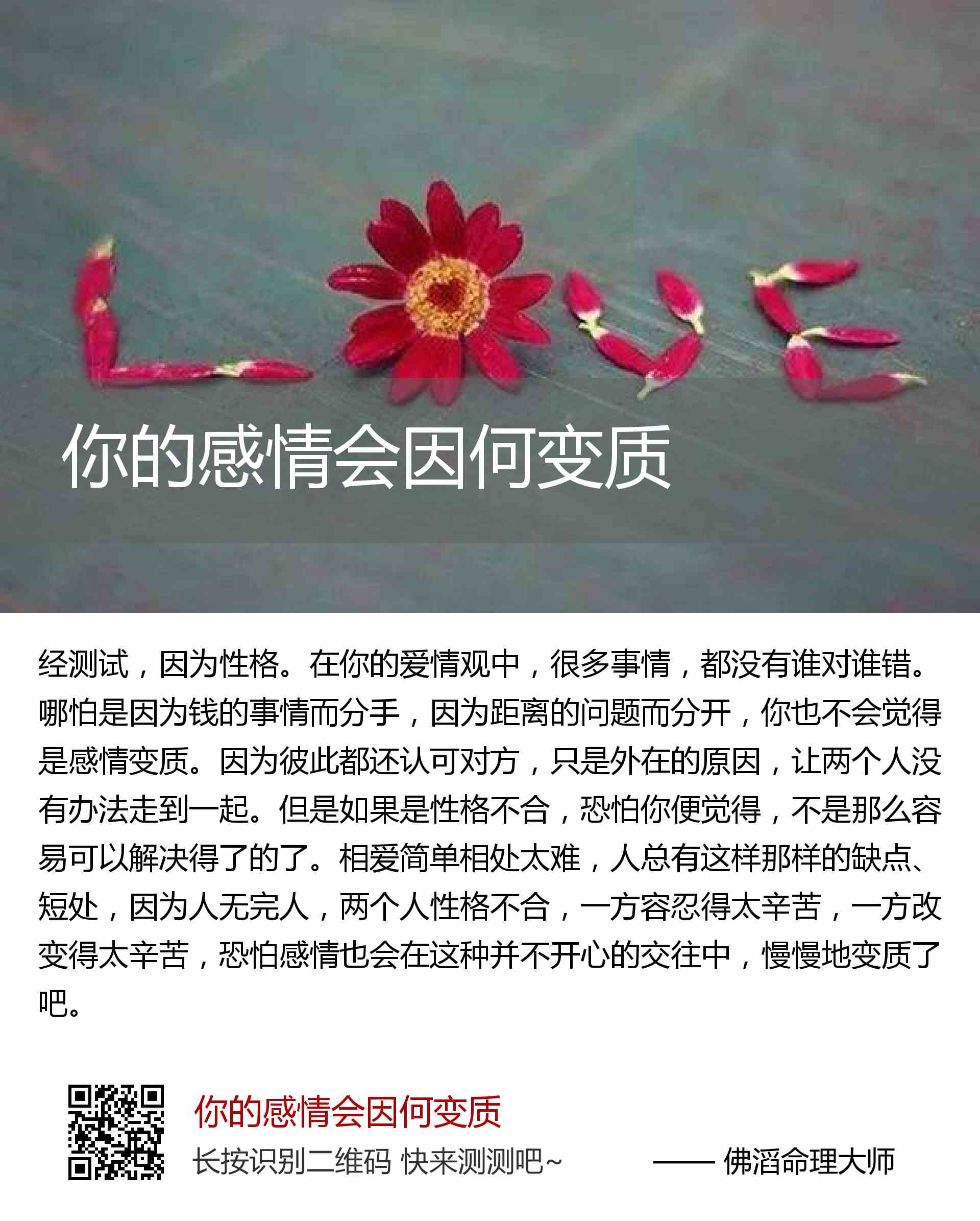在你的爱情观中,很多事情,都没有谁对谁错。哪怕是因为钱的事情而分手,因为距离的问题而分开,你也不会觉得是感情变质。因为彼此都还认可对方,只是外在的原因,让两个人没有办法走到一起。但是如果是性格不合,恐怕你便觉得,不是那么容易可以解决得了的了。相爱简单相处太难,人总有这样那样的缺点、短处,因为人无完人,两个人性格不合,一方容忍得太辛苦,一方改变得太辛苦,恐怕感情也会在这种并不开心的交往中,慢慢地变质了吧。