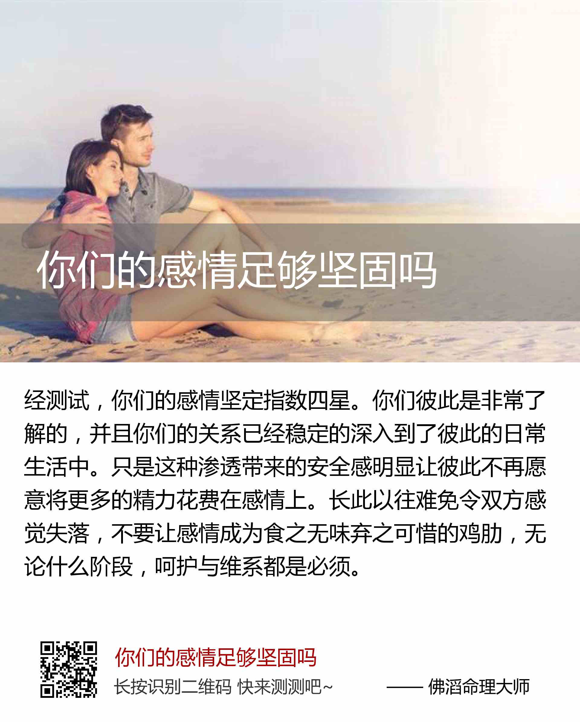 你们彼此是非常了解的,并且你们的关系已经稳定的深入到了彼此的日常生活中。只是这种渗透带来的安全感明显让彼此不再愿意将更多的精力花费在感情上。长此以往难免令双方感觉失落,不要让感情成为食之无味弃之可惜的鸡肋,无论什么阶段,呵护与维系都是必须。