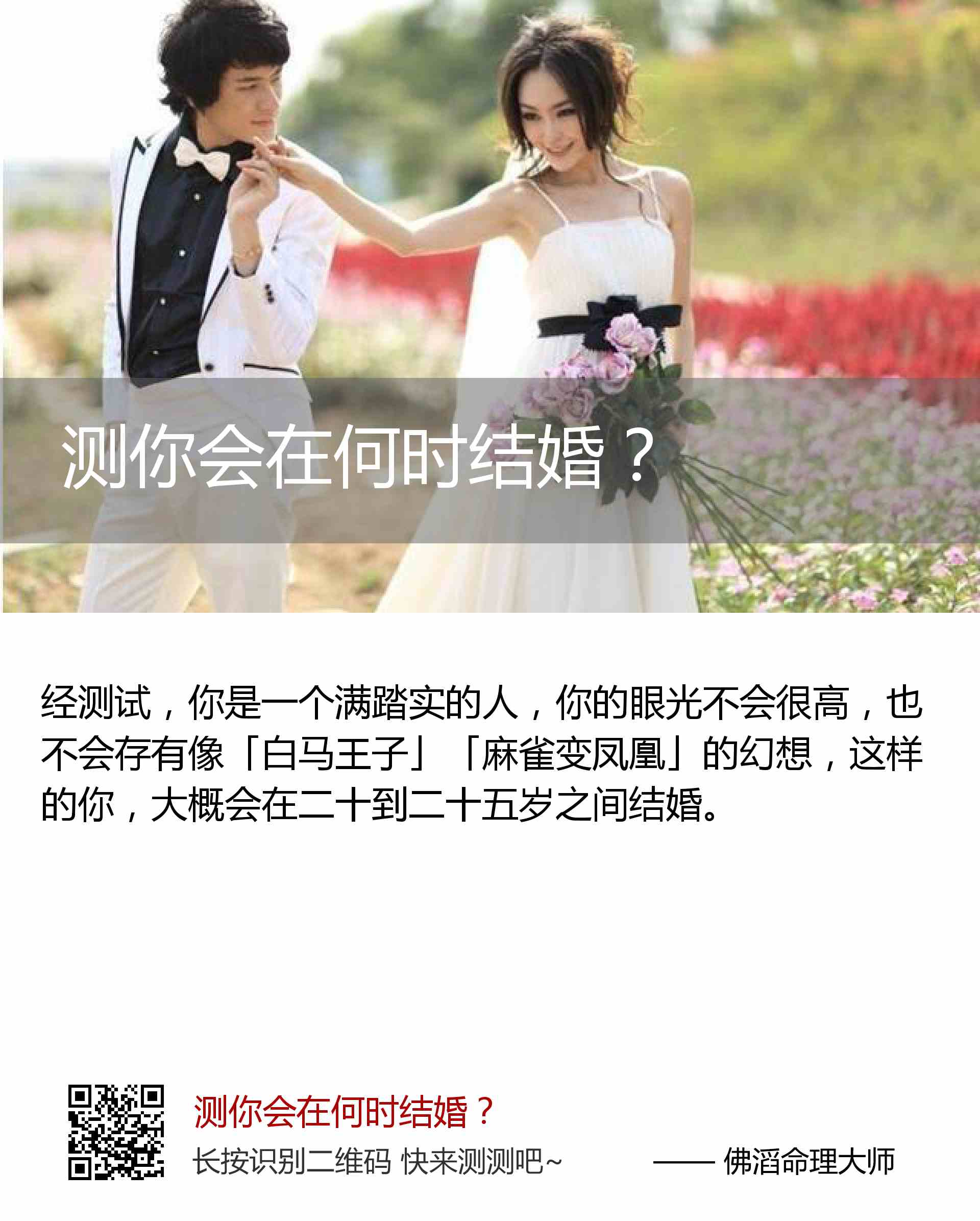 你是一个满踏实的人,你的眼光不会很高,也不会存有像「白马王子」「麻雀变凤凰」的幻想,这样的你,大概会在二十到二十五岁之间结婚。