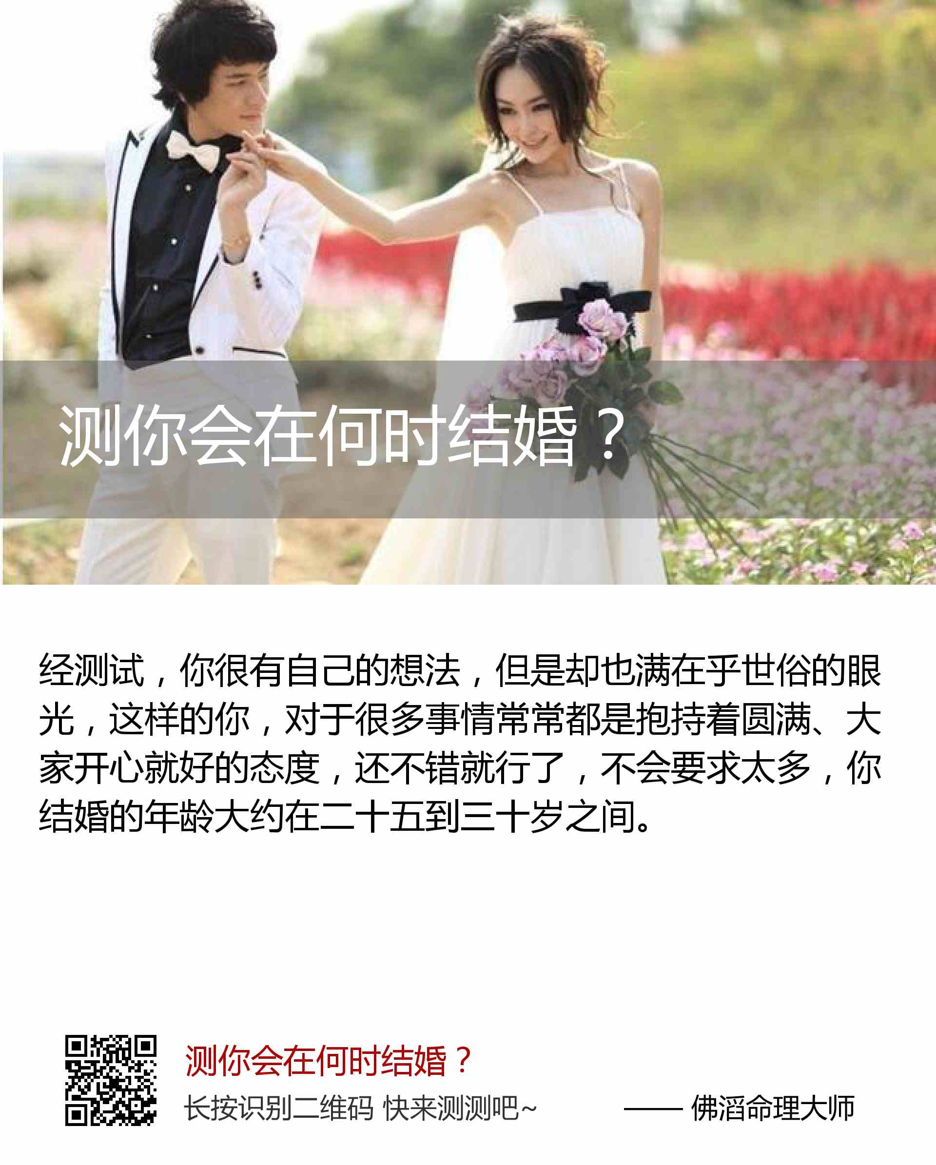 你很有自己的想法,但是却也满在乎世俗的眼光,这样的你,对于很多事情常常都是抱持着圆满、大家开心就好的态度,还不错就行了,不会要求太多,你结婚的年龄大约在二十五到三十岁之间。