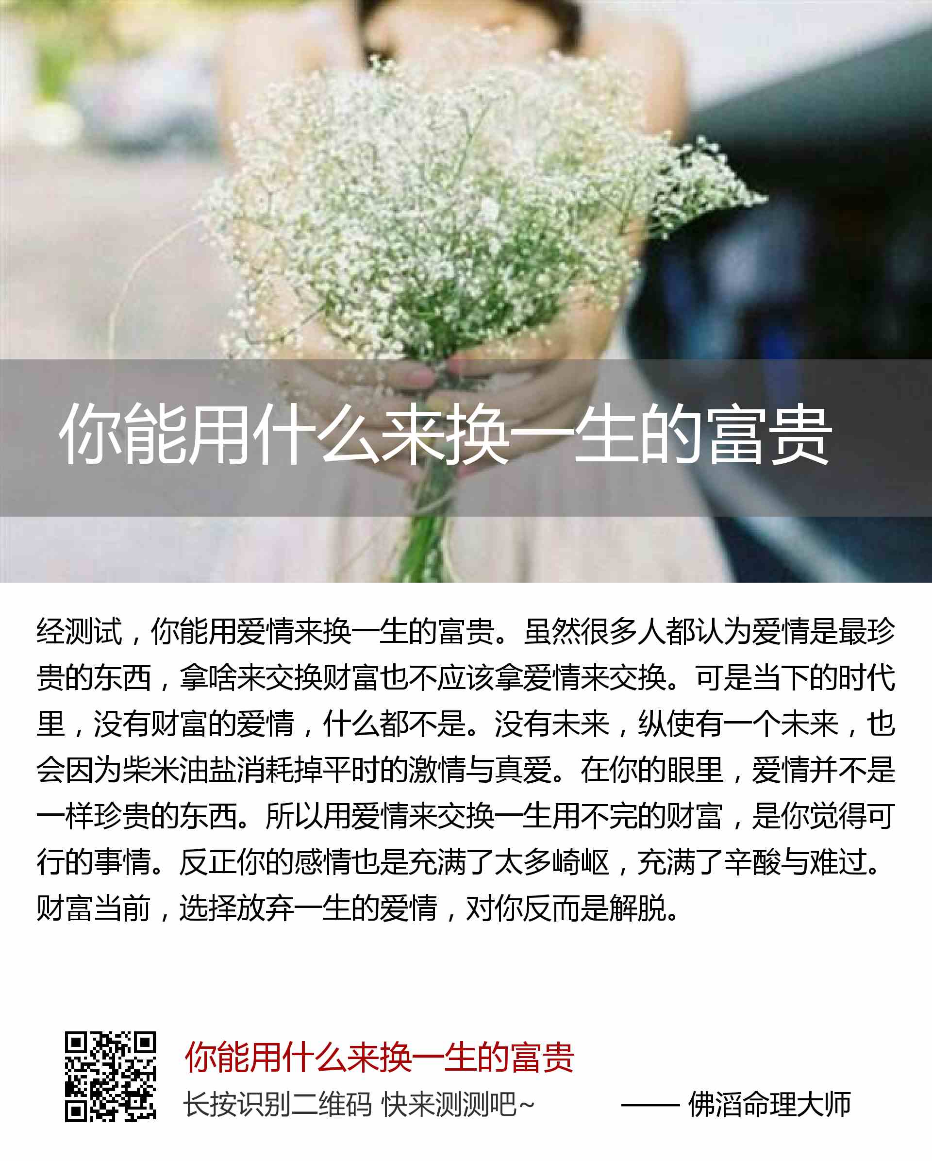 虽然很多人都认为爱情是最珍贵的东西,拿啥来交换财富也不应该拿爱情来交换。可是当下的时代里,没有财富的爱情,什么都不是。没有未来,纵使有一个未来,也会因为柴米油盐消耗掉平时的激情与真爱。在你的眼里,爱情并不是一样珍贵的东西。所以用爱情来交换一生用不完的财富,是你觉得可行的事情。反正你的感情也是充满了太多崎岖,充满了辛酸与难过。财富当前,选择放弃一生的爱情,对你反而是解脱。