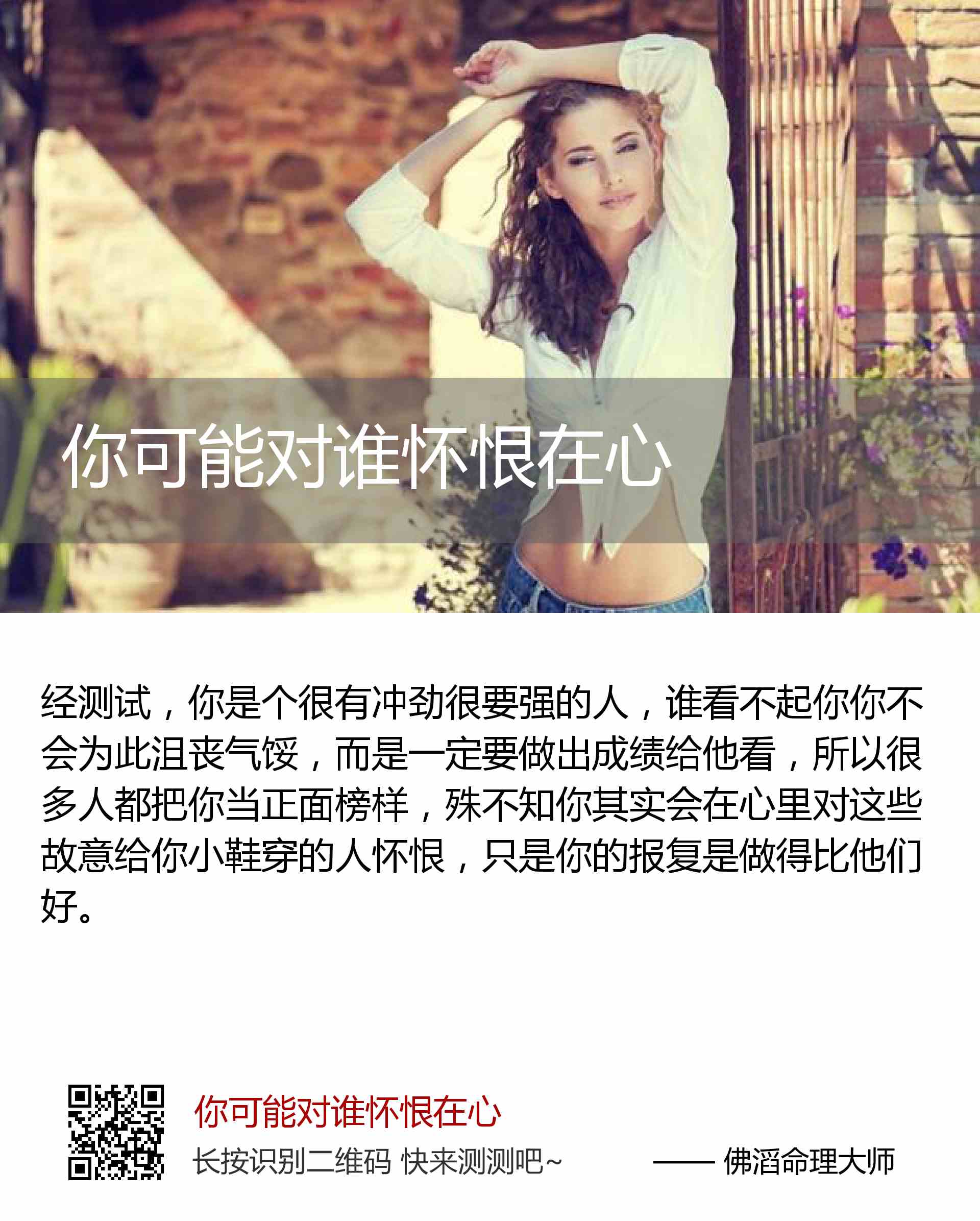 你是个很有冲劲很要强的人,谁看不起你你不会为此沮丧气馁,而是一定要做出成绩给他看,所以很多人都把你当正面榜样,殊不知你其实会在心里对这些故意给你小鞋穿的人怀恨,只是你的报复是做得比他们好。