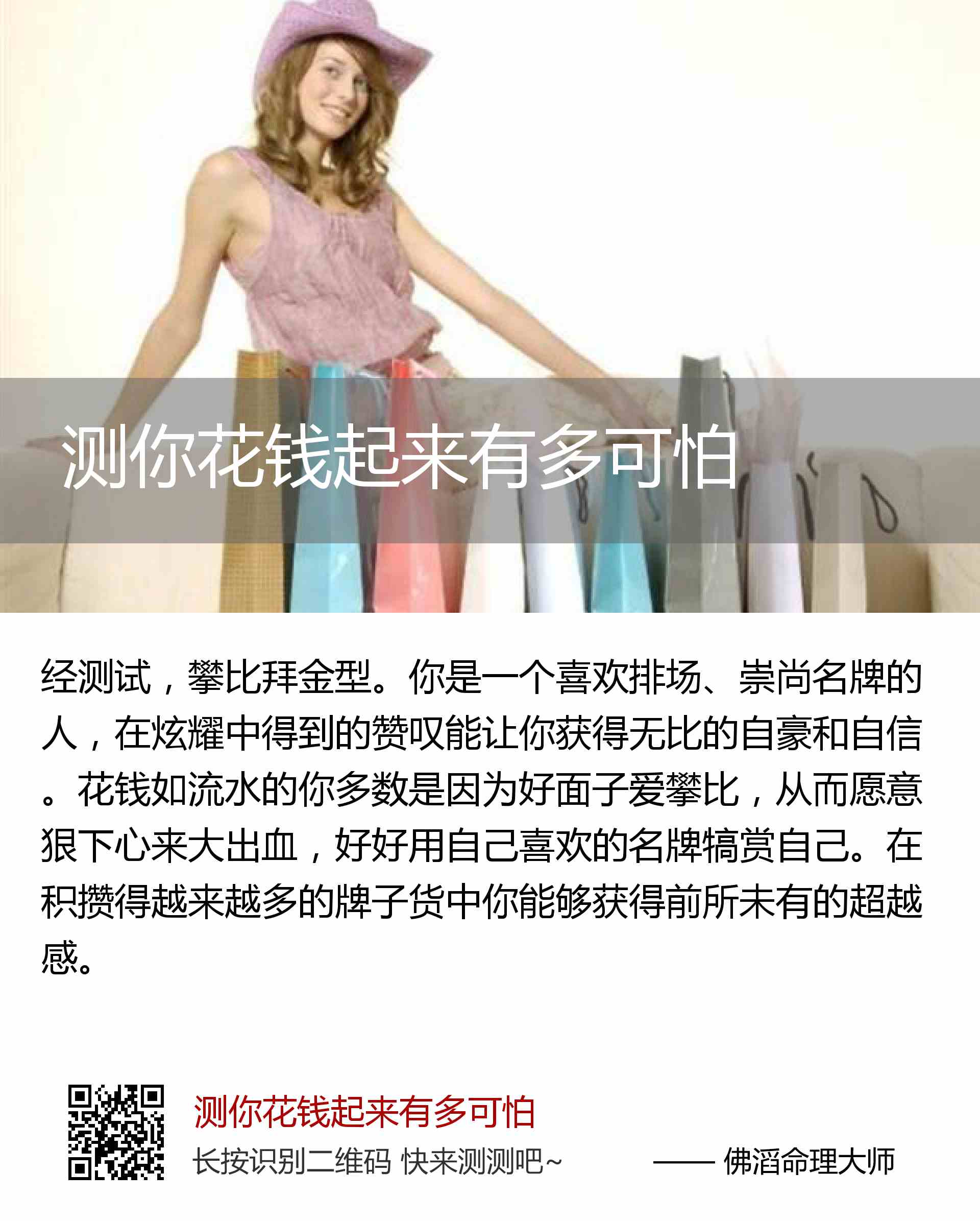 你是一个喜欢排场、崇尚名牌的人,在炫耀中得到的赞叹能让你获得无比的自豪和自信。花钱如流水的你多数是因为好面子爱攀比,从而愿意狠下心来大出血,好好用自己喜欢的名牌犒赏自己。在积攒得越来越多的牌子货中你能够获得前所未有的超越感。