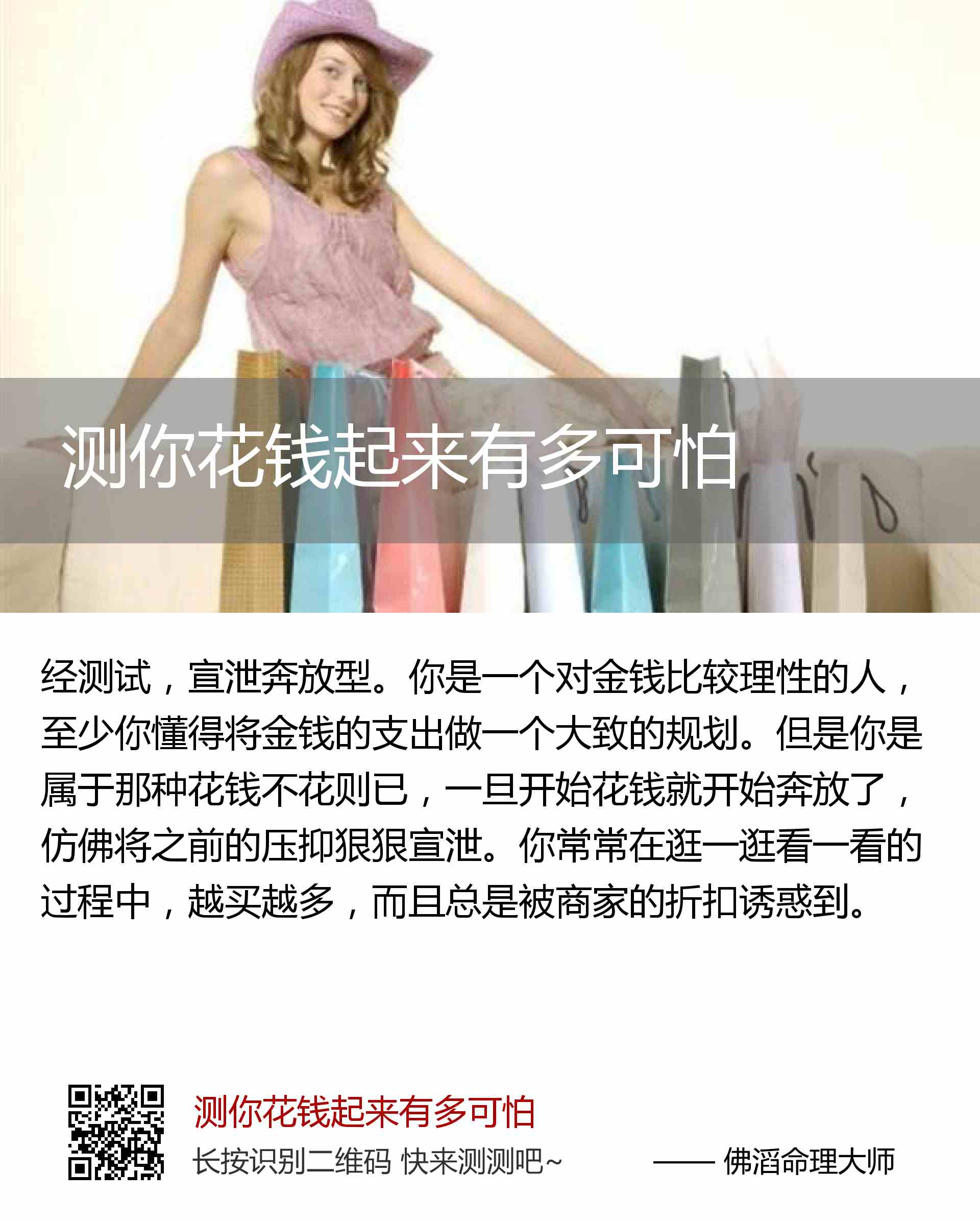 你是一个对金钱比较理性的人,至少你懂得将金钱的支出做一个大致的规划。但是你是属于那种花钱不花则已,一旦开始花钱就开始奔放了,仿佛将之前的压抑狠狠宣泄。你常常在逛一逛看一看的过程中,越买越多,而且总是被商家的折扣诱惑到。