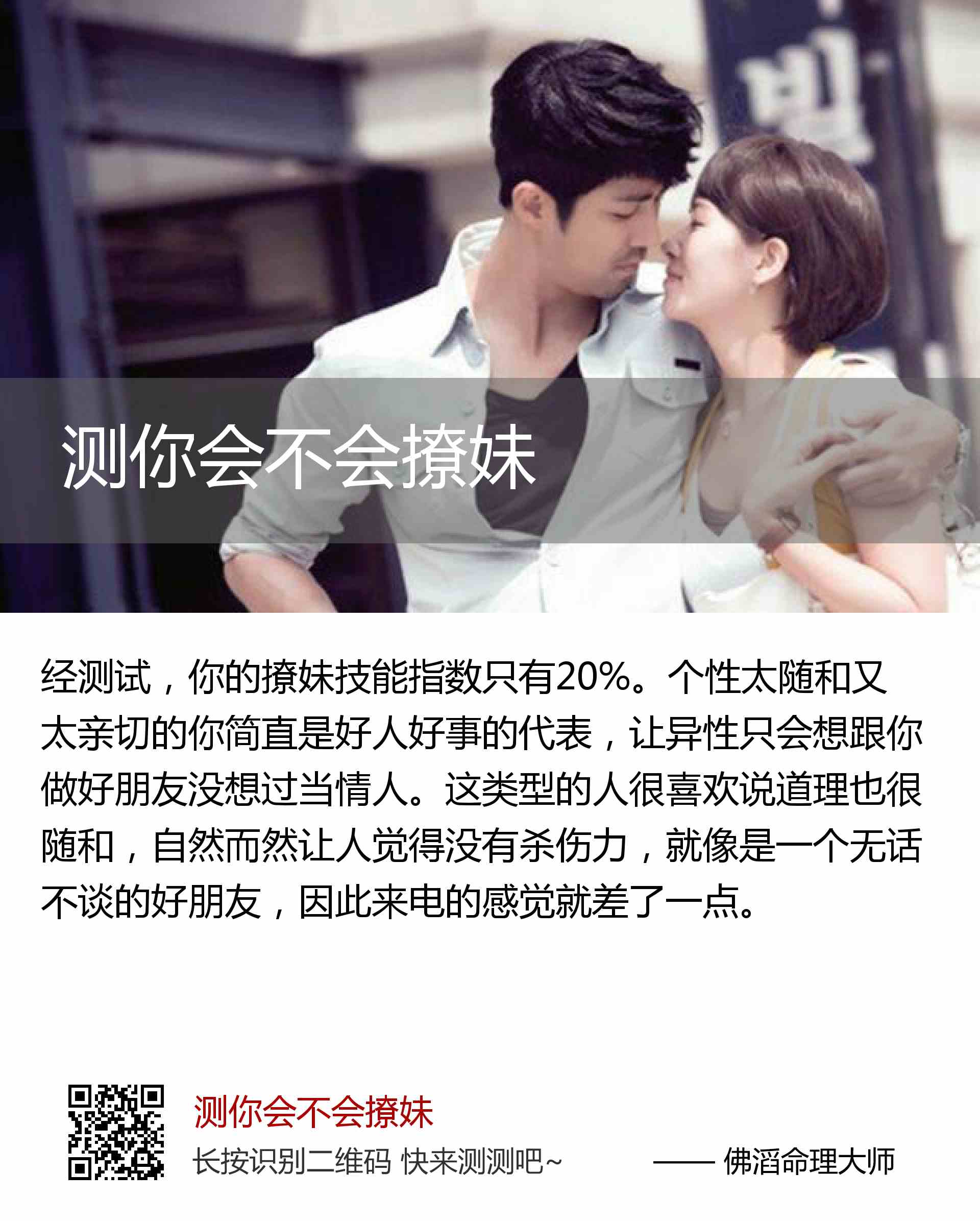 个性太随和又太亲切的你简直是好人好事的代表,让异性只会想跟你做好朋友没想过当情人。这类型的人很喜欢说道理也很随和,自然而然让人觉得没有杀伤力,就像是一个无话不谈的好朋友,因此来电的感觉就差了一点。