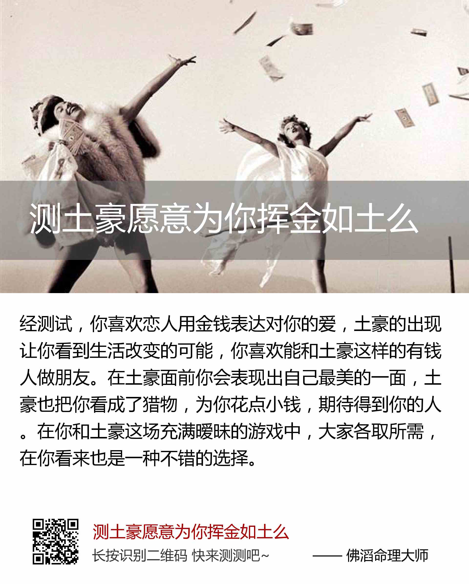 你喜欢恋人用金钱表达对你的爱,土豪的出现让你看到生活改变的可能,你喜欢能和土豪这样的有钱人做朋友。