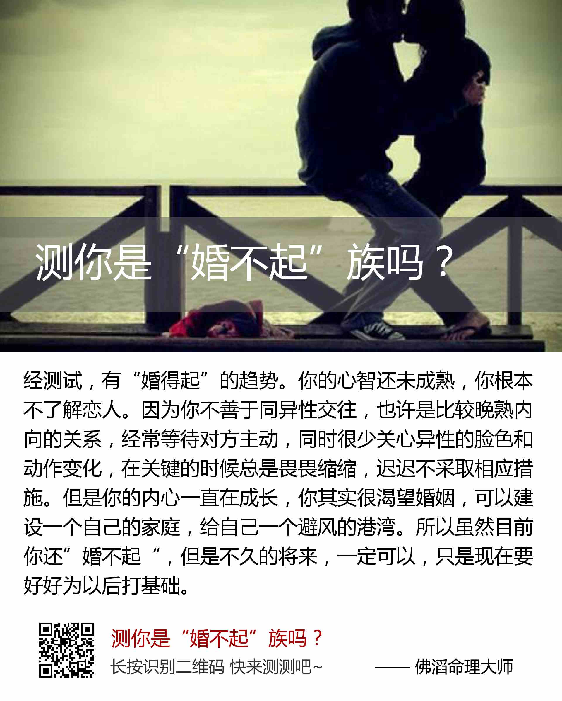 你的心智还未成熟,你根本不了解恋人。因为你不善于同异性交往,也许是比较晚熟内向的关系,经常等待对方主动,同时很少关心异性的脸色和动作变化,在关键的时候总是畏畏缩缩,迟迟不采取相应措施。但是你的内心一直在成长,你其实很渴望婚姻,可以建设一个自己的家庭,给自己一个避风的港湾。所以虽然目前你还”婚不起“,但是不久的将来,一定可以,只是现在要好好为以后打基础。