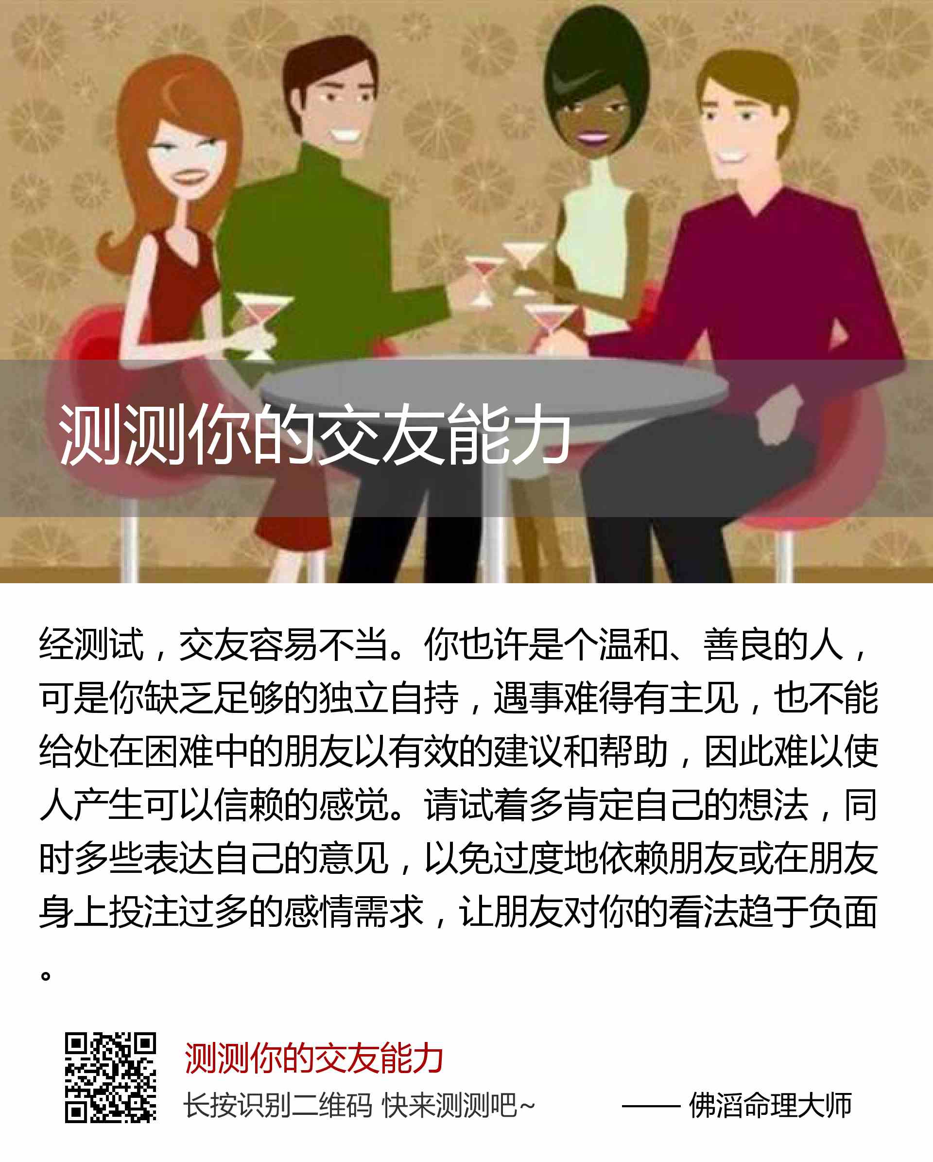 你也许是个温和、善良的人,可是你缺乏足够的独立自持,遇事难得有主见,也不能给处在困难中的朋友以有效的建议和帮助,因此难以使人产生可以信赖的感觉。请试着多肯定自己的想法,同时多些表达自己的意见,以免过度地依赖朋友或在朋友身上投注过多的感情需求,让朋友对你的看法趋于负面。